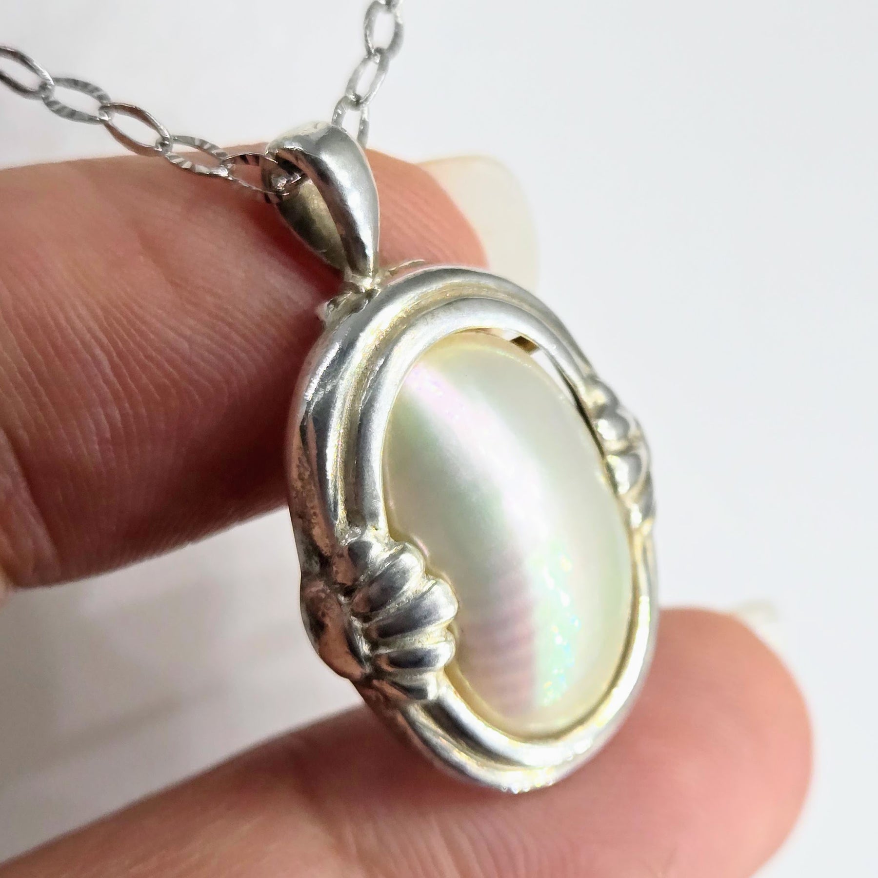 The "Old & Neuveau" is a New-Old-Stock, 1.25", Vintage Pendant of Mother of Pearl (Turbo Shell), in an Art Nouveau Style Sterling Frame on a 16", Anti-tarnish-treated, Faceted Oval Link, Sterling Chain & it's LOVELY! :D