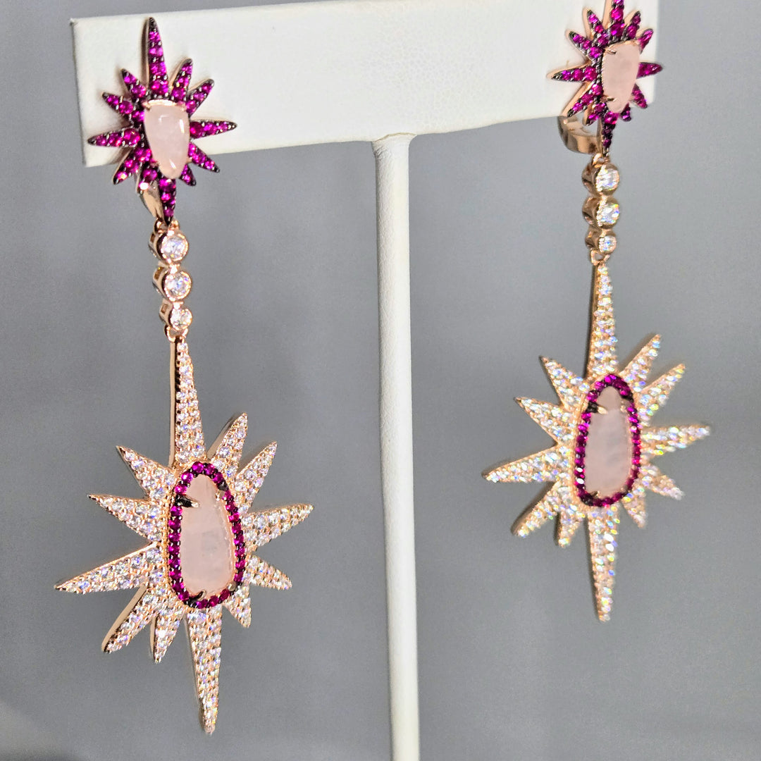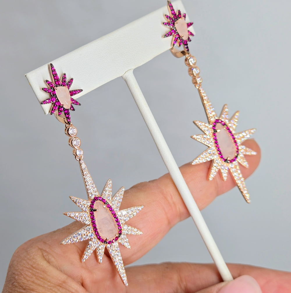 "Starfire PINKS!" 3" Earrings - Pink Sapphire, White Zircon, Rose Quartz, Anti-tarnish Rose Gold Sterling