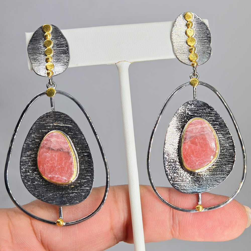 "Mid-mod Pink" 2.75" Earrings - Rhodochrosite, Black Sterling, 18k