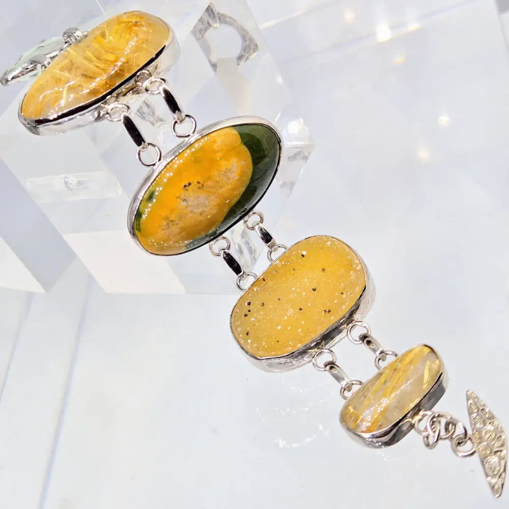The "Golden Sands" 7" - 8" Bracelet is a Fantastically-FRESH & Warm Mix of Bezel Set Prasiolite, Druzy, Gold Rutilated Quartz, & Ocean Jasper, in Anti-tarnish Treated Sterling Silver & Finished with an Adjustable Length, Textured, Toggle Clasp That's Super-secure & Stylish!