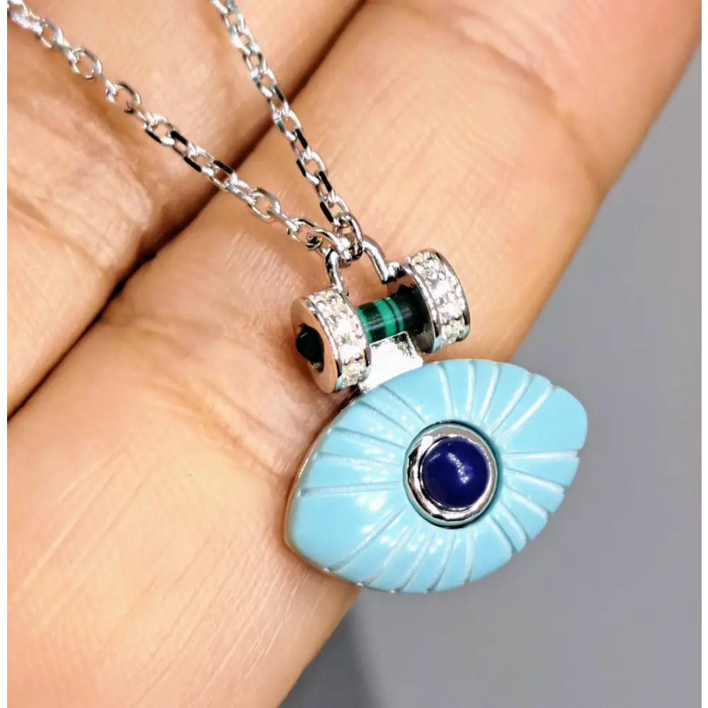 Beauty IS In The Eye of the Beholder - The Beholder of the "Beholder In Sky Blue" 15"-17" Necklace with a Stationary Evil Eye Pendant of a Composite Turquoise with a Lapis 'Pupil', Suspended from an East-West Malachite with Sparkling Zircon Stone Accents in 18K Gold Over Sterling or Anti-tarnish Treated Sterling.