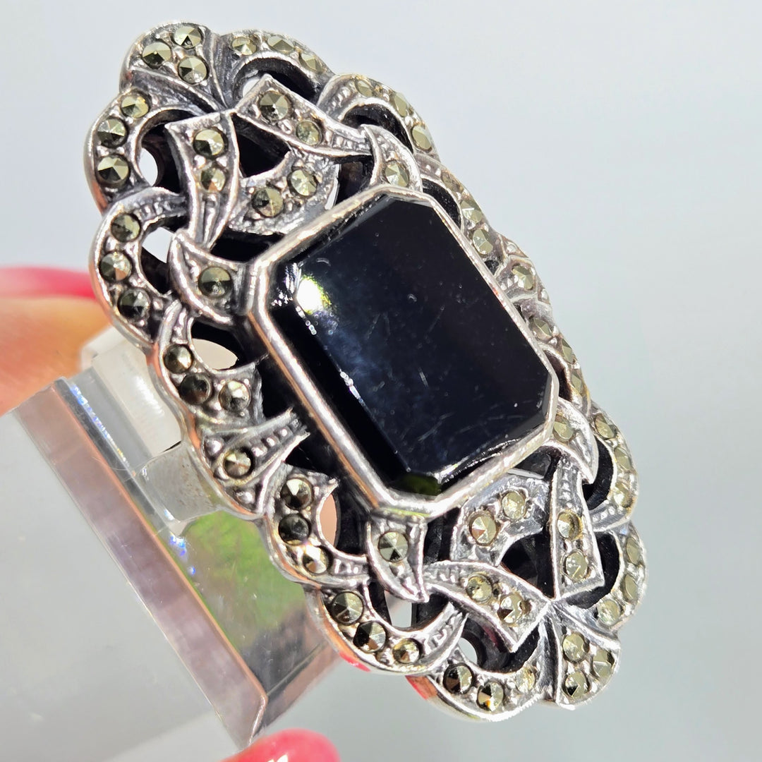 "Gilded Cage" Sz 8.25 Ring - Onyx, Marcasite, Sterling