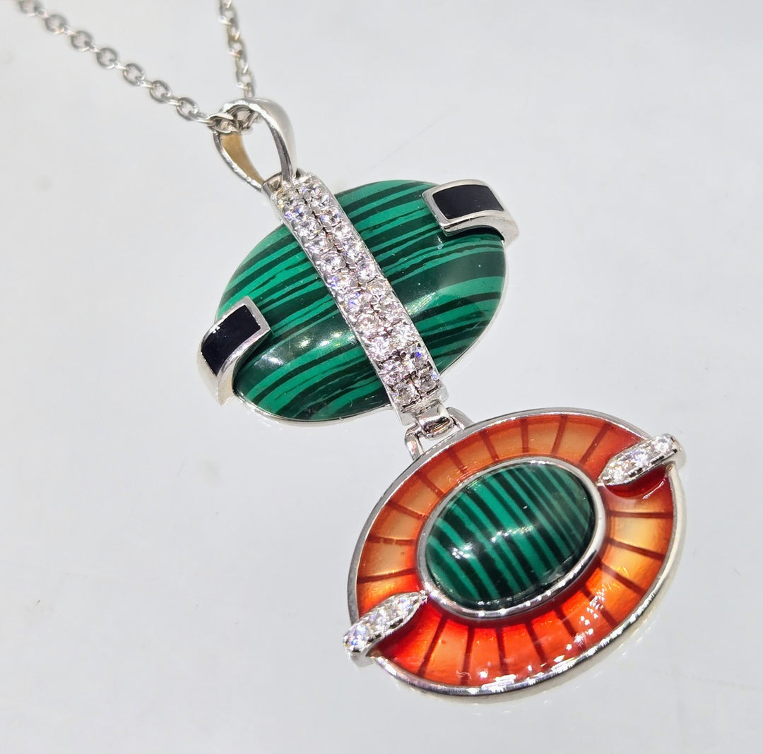 "Deco Dreaming" 1.5" Pendant Necklace - Malachite, Enamel, Zircon, Anti-tarnish Sterling
