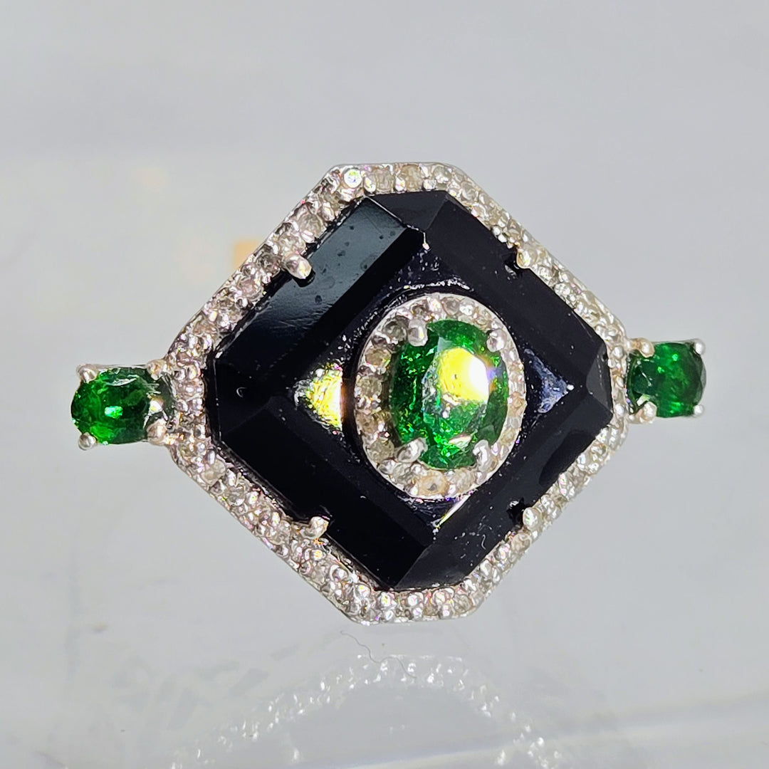 "Deco Divine" Sz 7.5 Ring -Emeralds, Diamonds, Onyx, Anti-tarnish Sterling