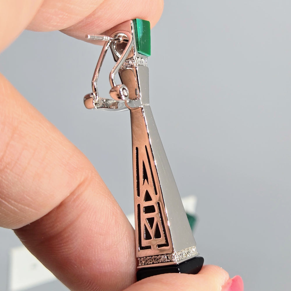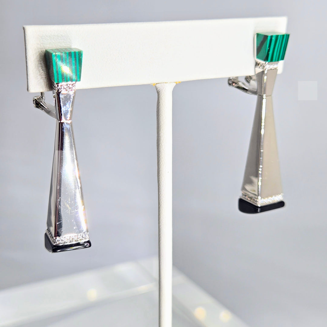 "Industrial Age Dames" 2" Earrings - Malachite, Onyx, Zircon, Anti-tarnish Sterling