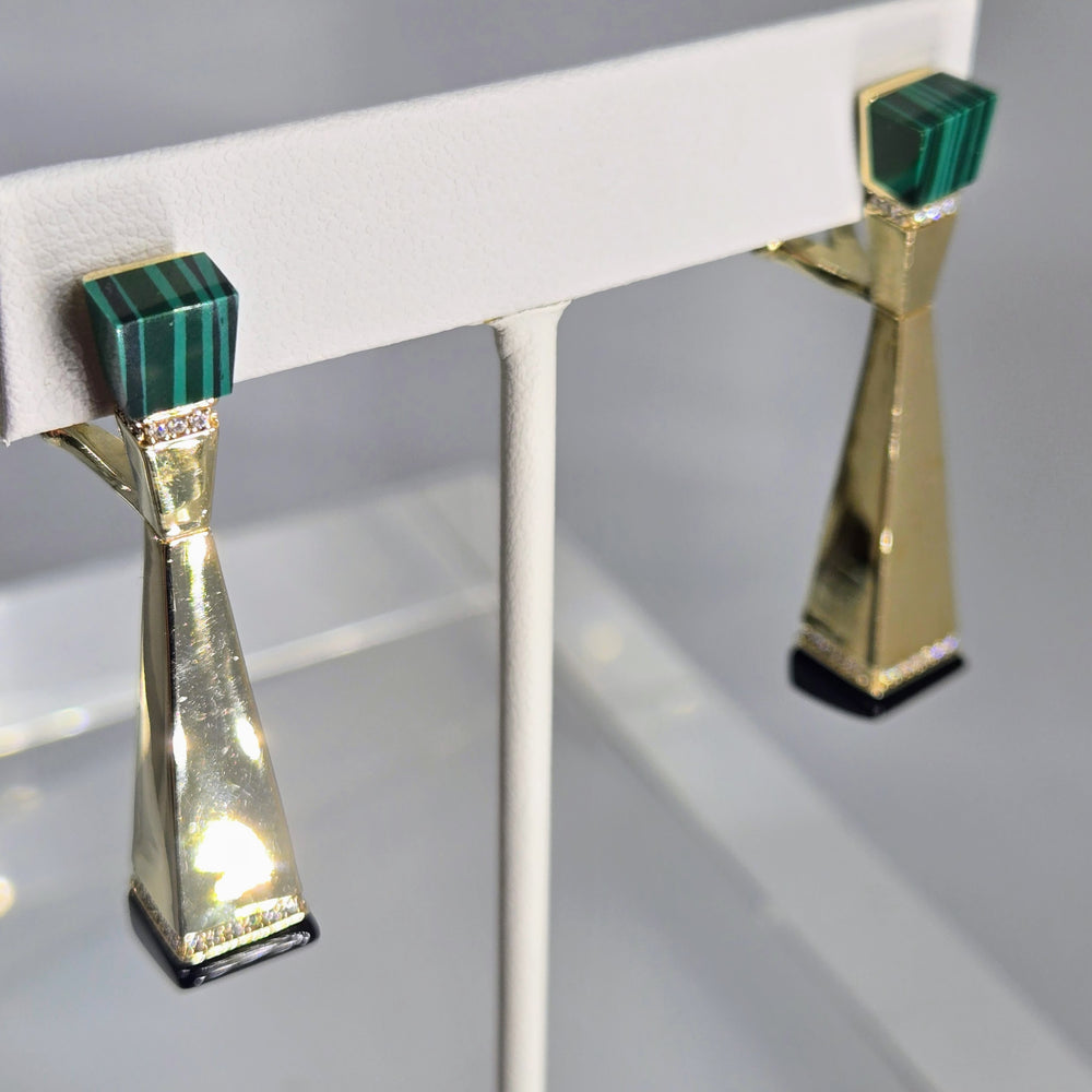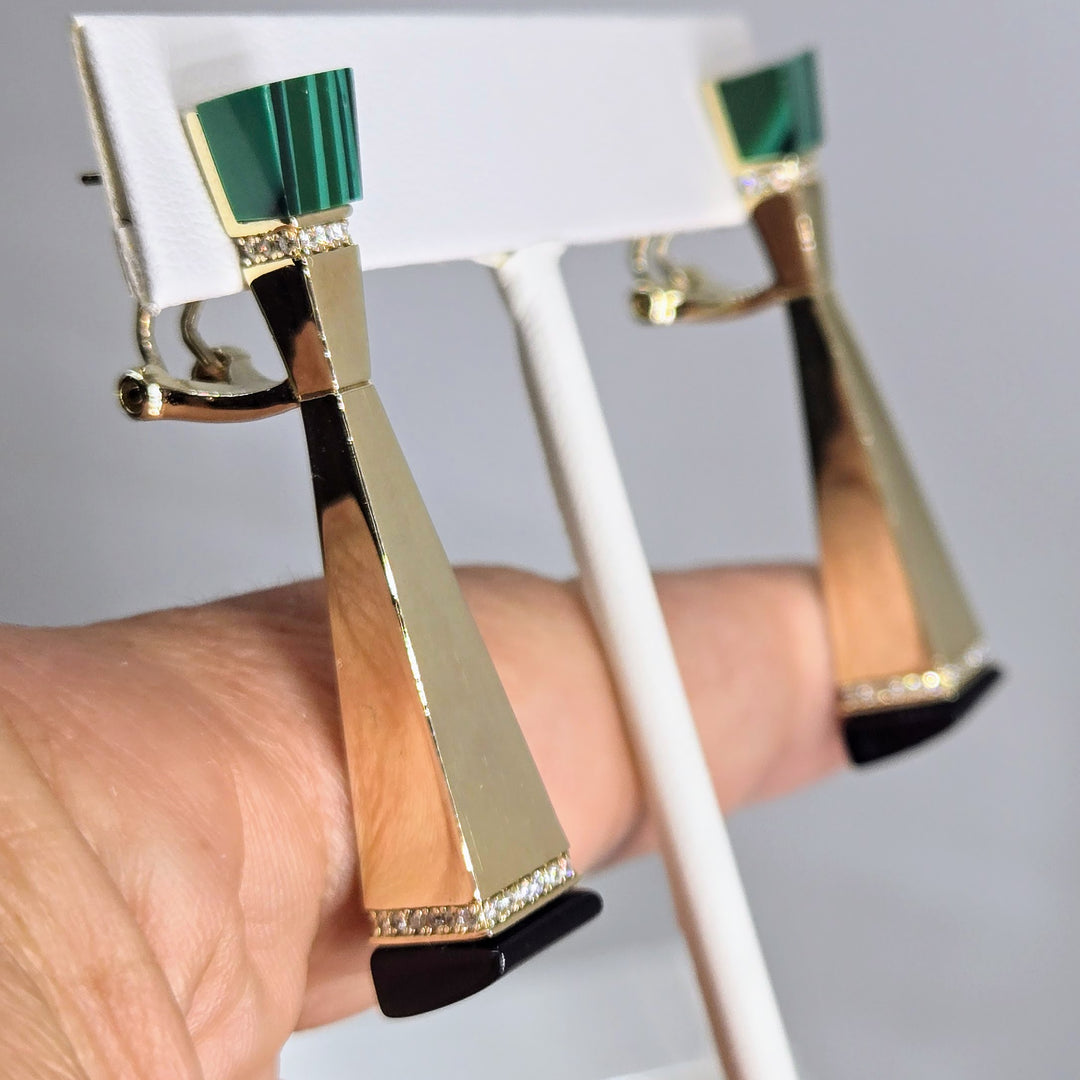 "Industrial Age Dames" 2" Earrings - Malachite, Onyx, Zircon, Gold Anti-tarnish Sterling