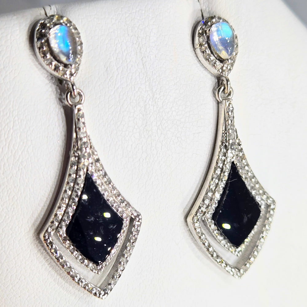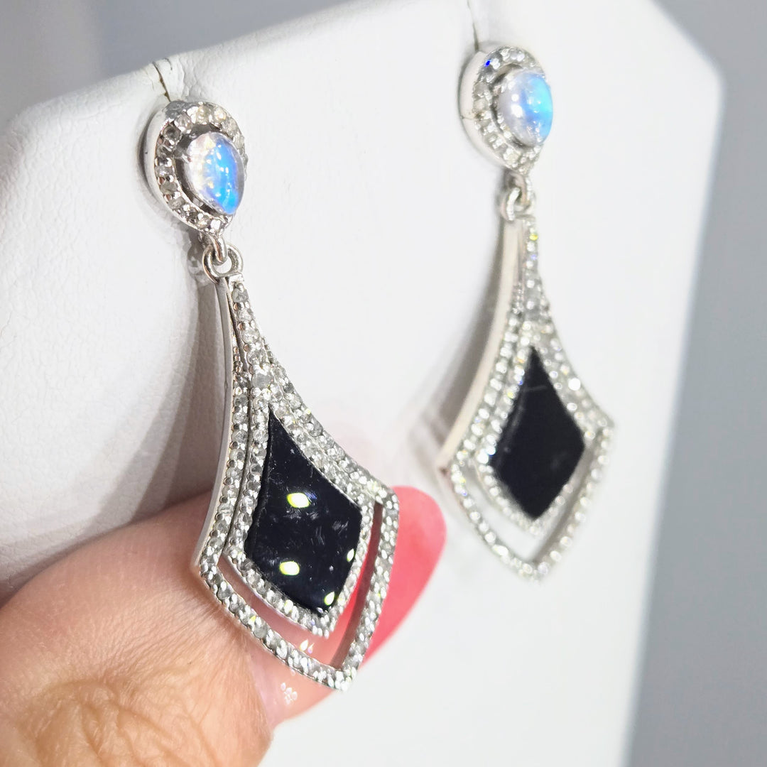 "Spades" 1.5" Earrings - Diamonds, Onyx, Moonstone, Anti-tarnish Sterling