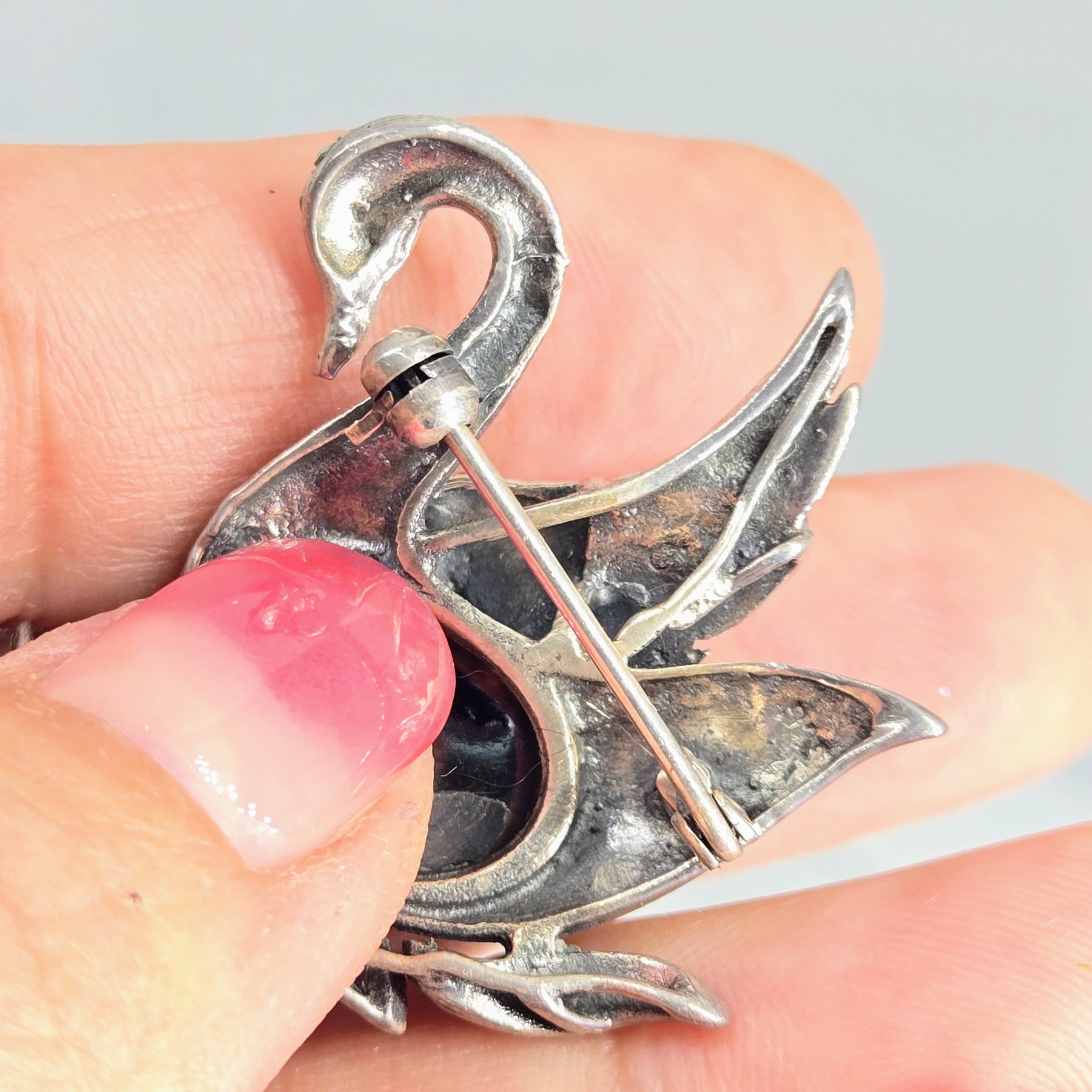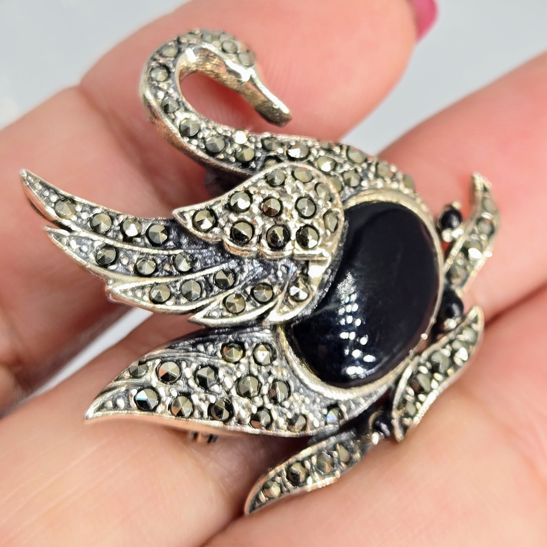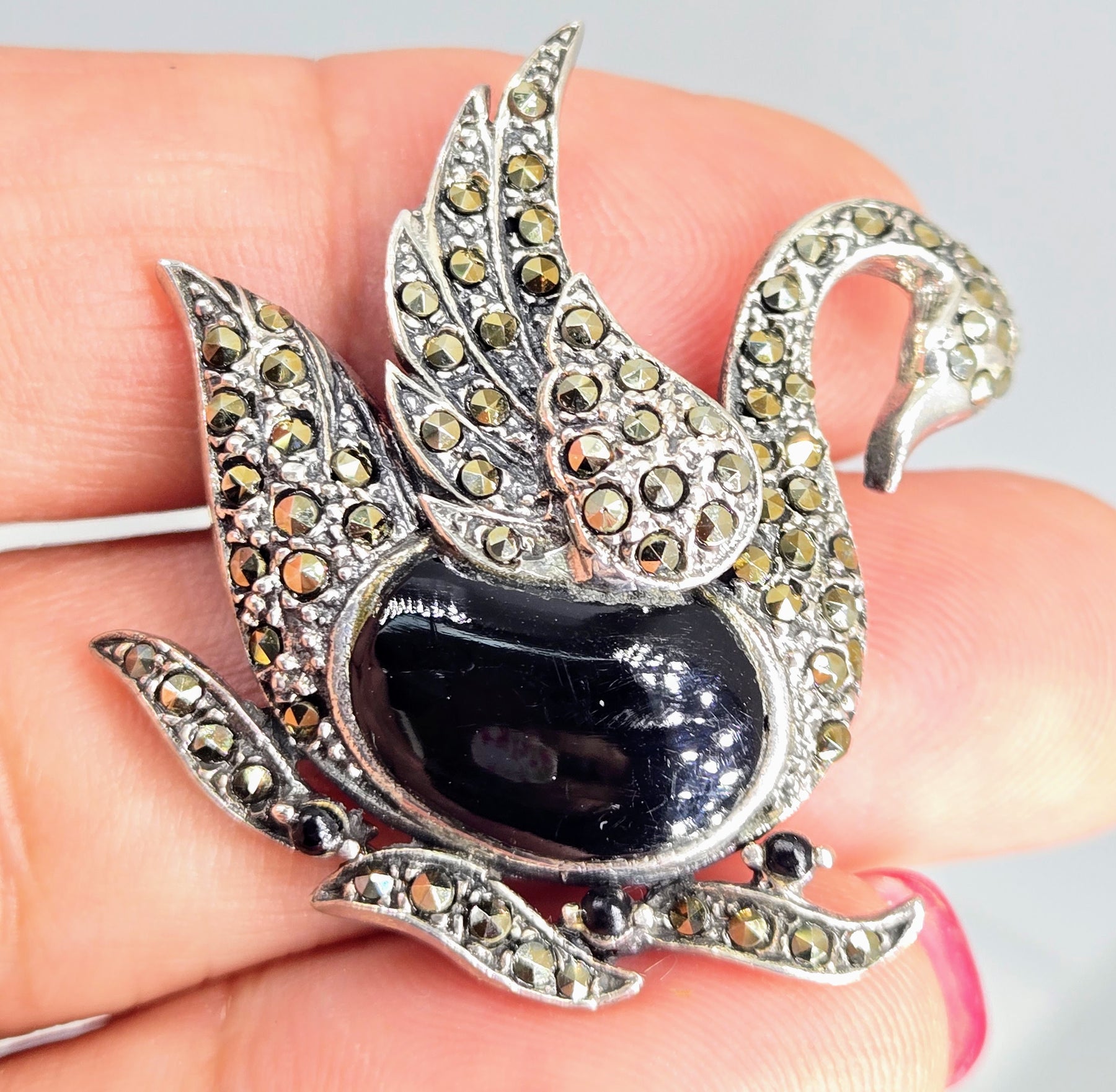 The "Black Beauty" 1" X 2.25" Brooch/Pearl Enhancer is New-Old-Stock & exquisitely handmade of rich Black Onyx, with sparkles of Marcasite & Garnet accents, in Sterling Silver. It's excellent as a brooch, exquisite as a ' bow tie' & excruciatingly SPECTACULAR as a Pearl Enhancer*!