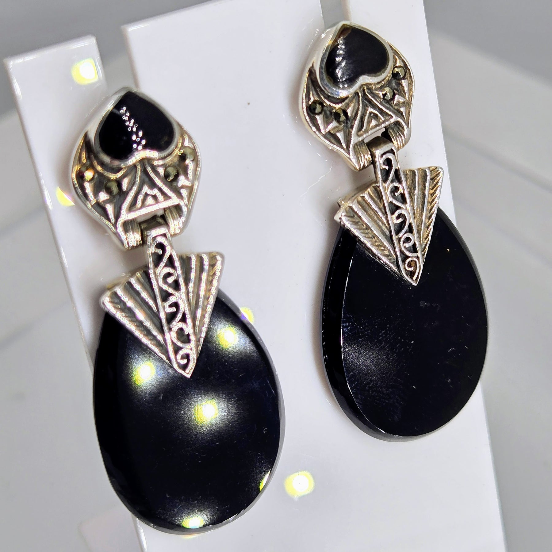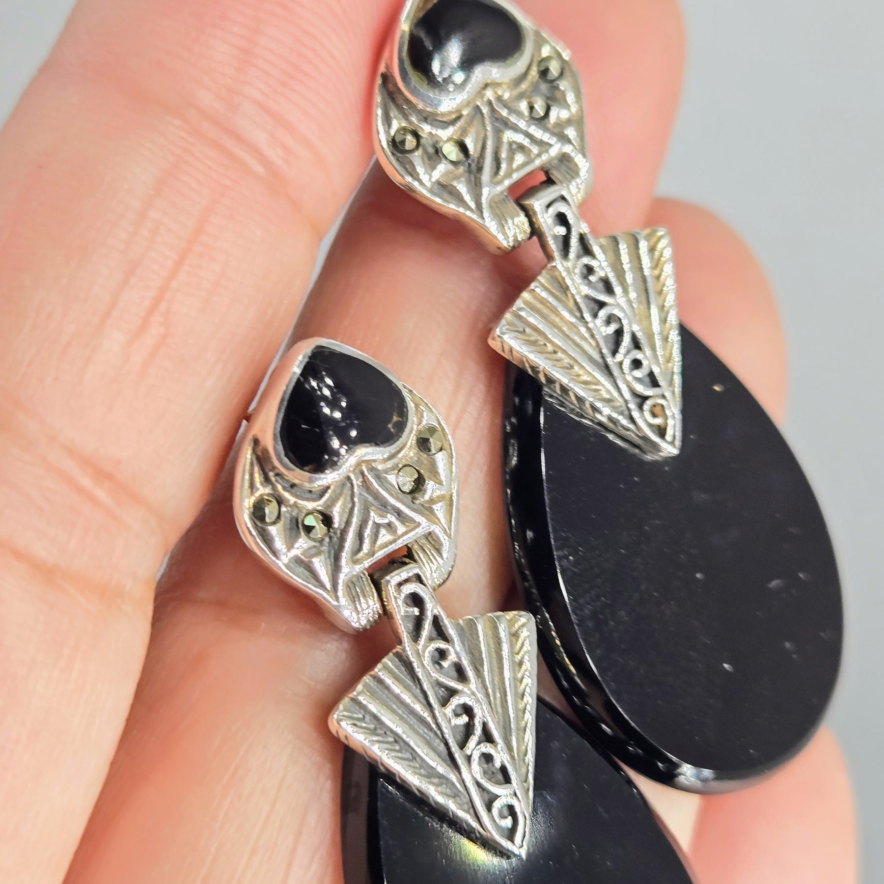 The "I <3 Deco Doorknockers" 2" post dangle earrings are Onyx & Marcasite in Sterling. They're New-Old-Stock & exquisitely handmade of rich Black Onyx, with sparkles of Marcasite. They're lightweight & on-the-lobe. So, piercings will be covered & they're the perfect, 'basic-not-boring' black earring!