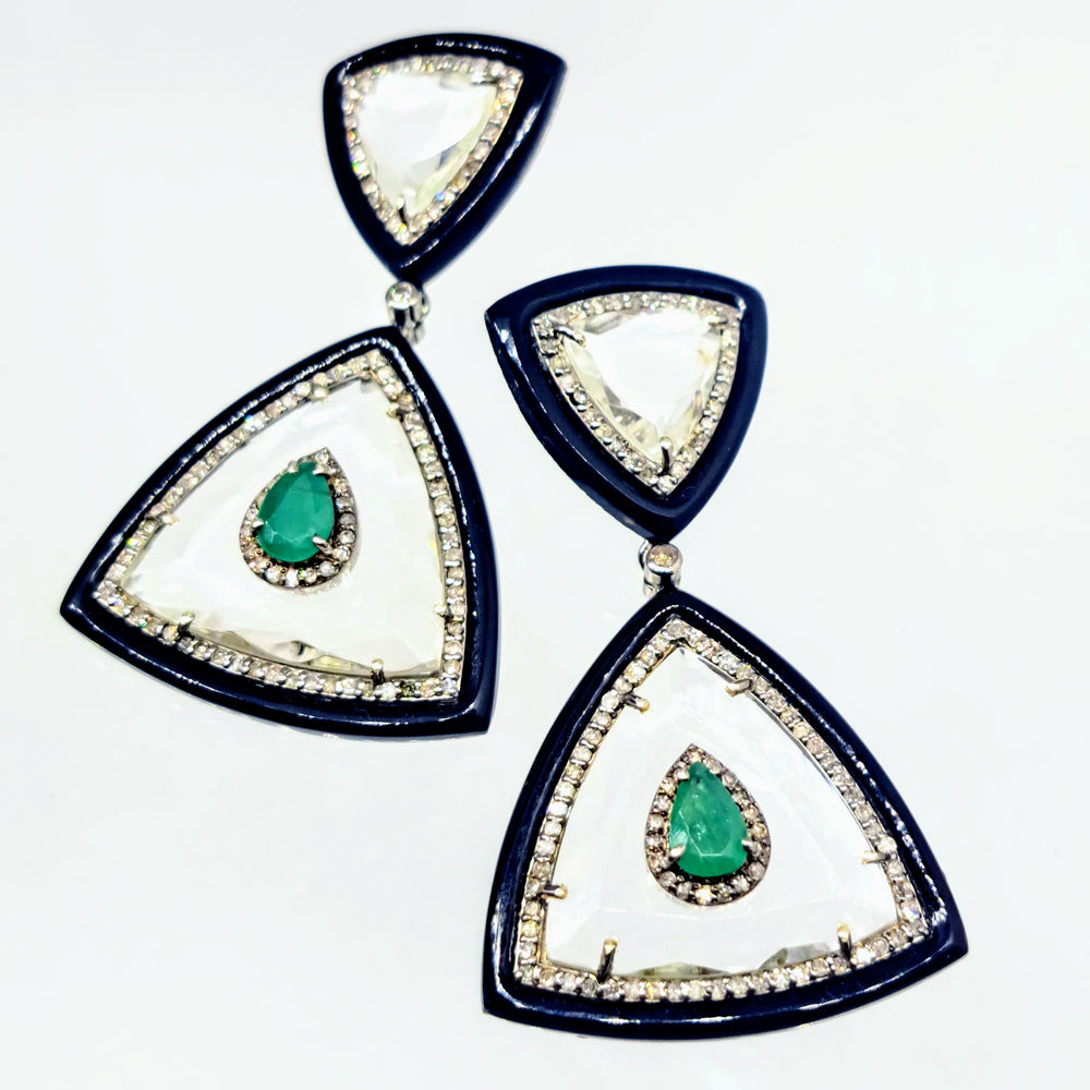 "The Sophisticate" 2" Earrings - Diamonds, Emerald, Quartz, Black Onyx, Sterling, 18K Gold Posts