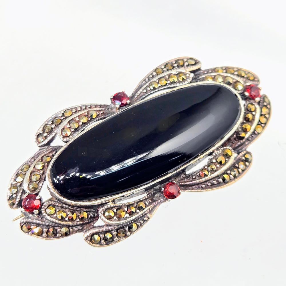 "Black Beauty" 1" X 2.25" Brooch/Pearl Enhancer - Onyx, Garnet, Marcasite, Sterling