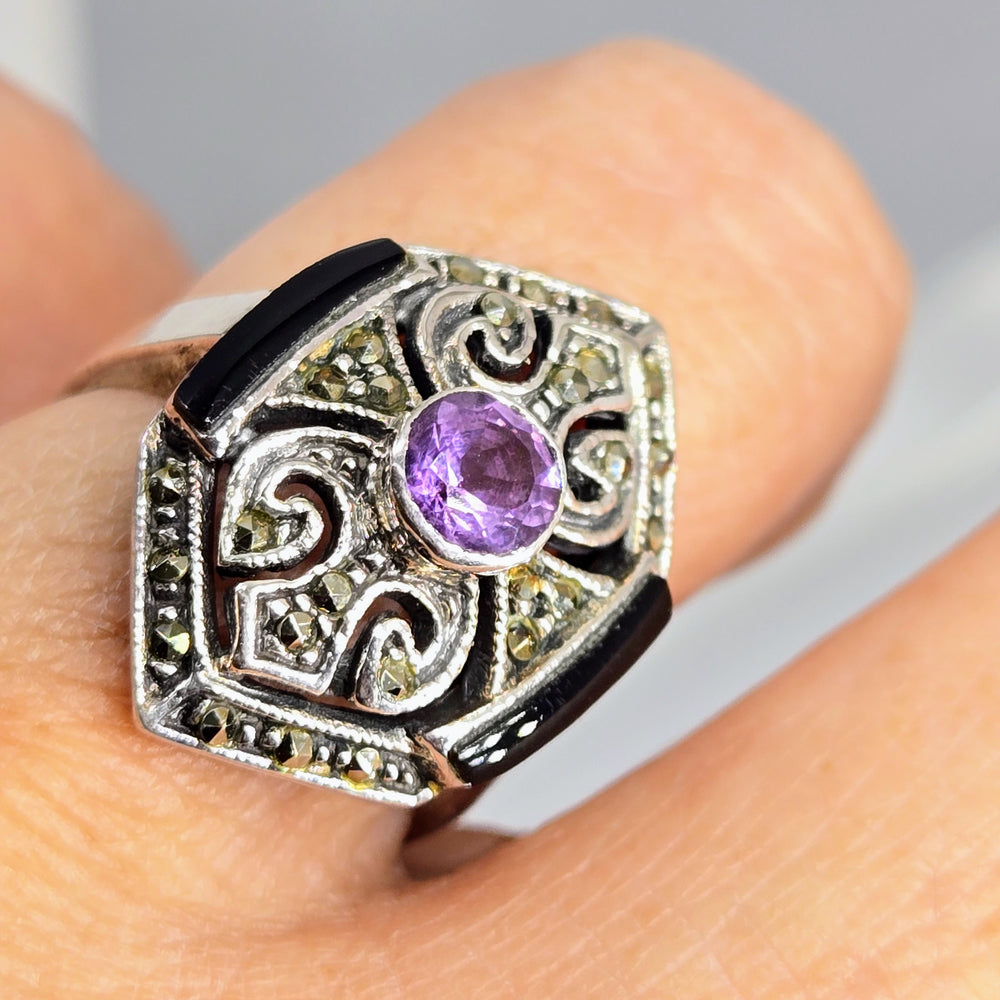 "The Dish's Dark Desire" Sz 7.5 Ring - Amethyst, Onyx, Marcasite, Sterling
