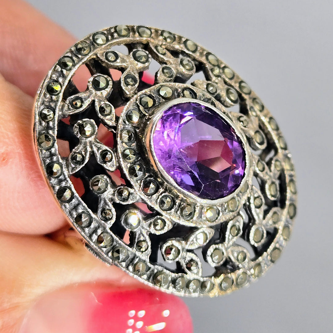 "Grandma's Ring" Sz 8 Ring - Amethyst, Marcasite, Sterling
