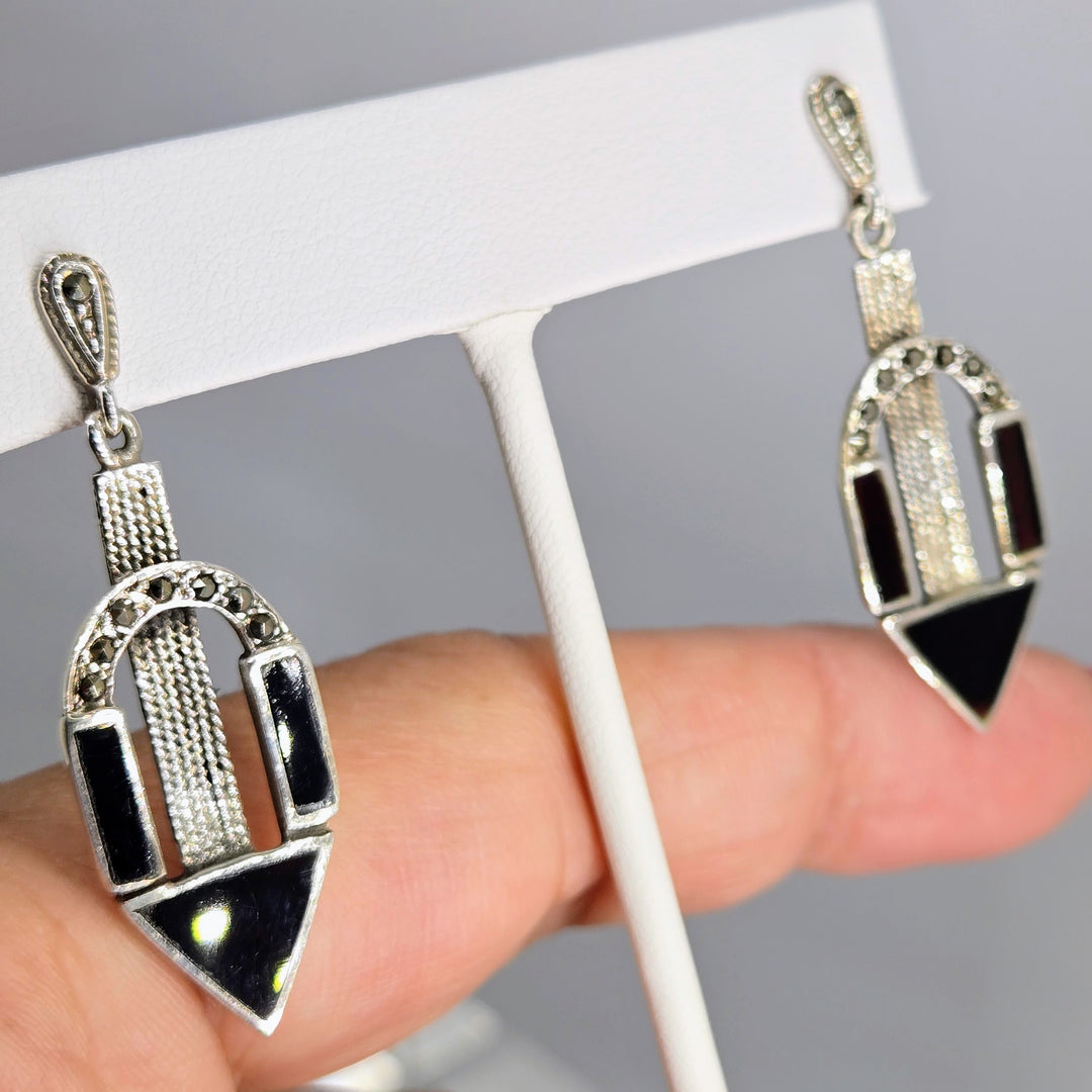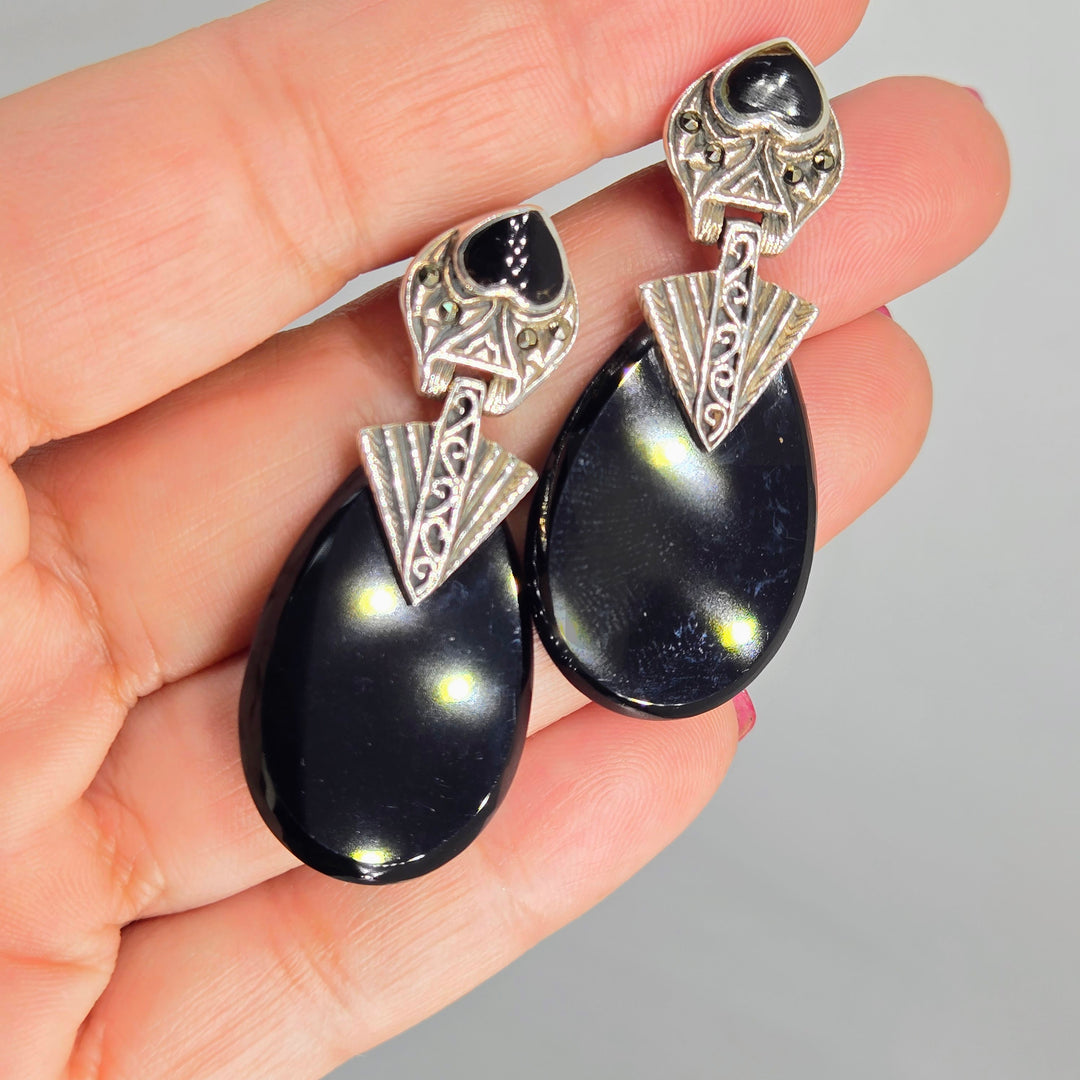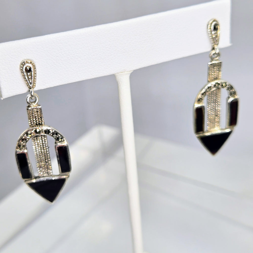 "I <3 Deco Doorknockers" 2" Earrings - Onyx, Marcasite, Sterling