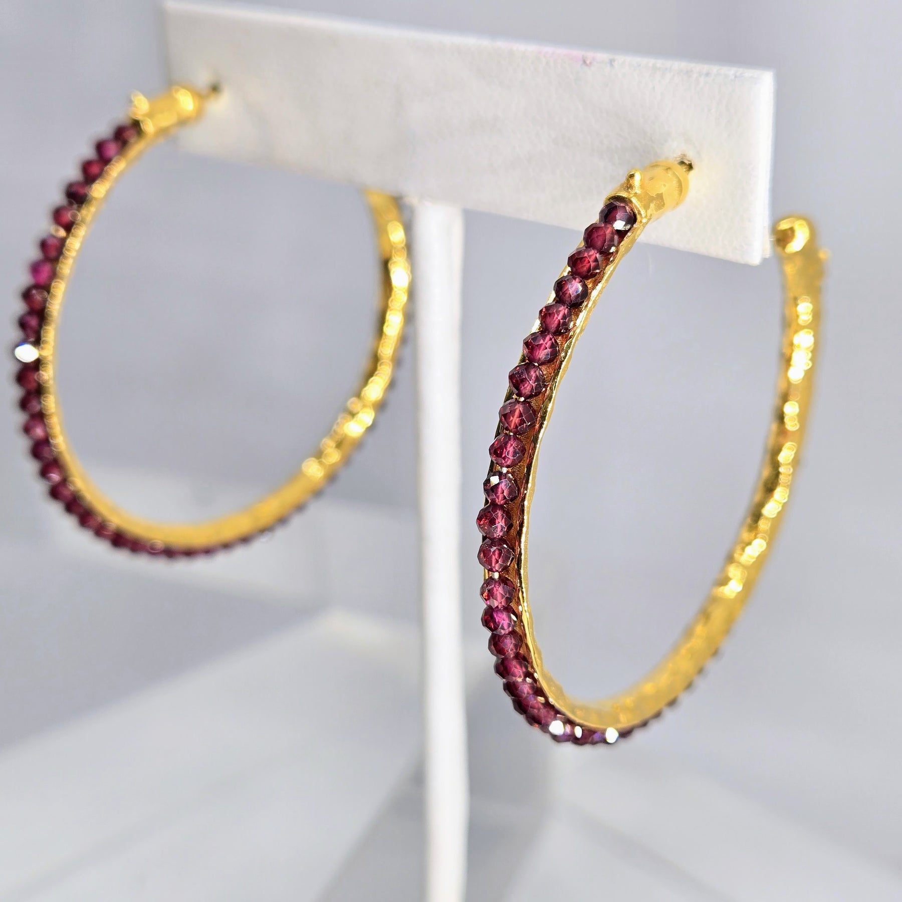 The "Berry Beautiful Hoops" are 2" Post Hoop Earrings featuring microfaceted Rhodolite Garnet, wired onto 18k Gold Sterling hoop earrings & they're magical!