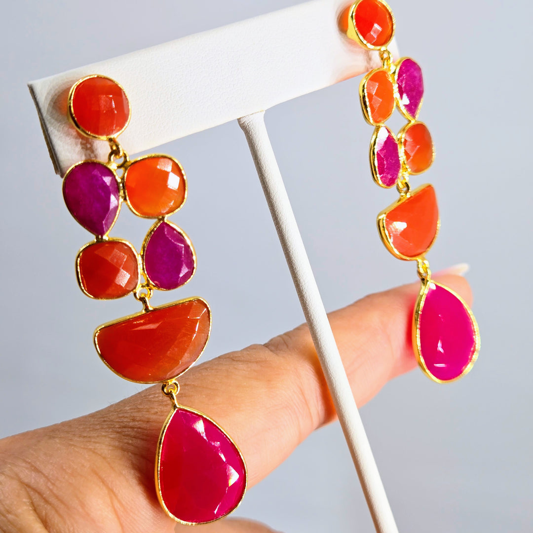 "Fruity Pebbles" 2.75" Earrings - Carnelian, Pink Quartz, 18k Gold, Jeweler's Brass