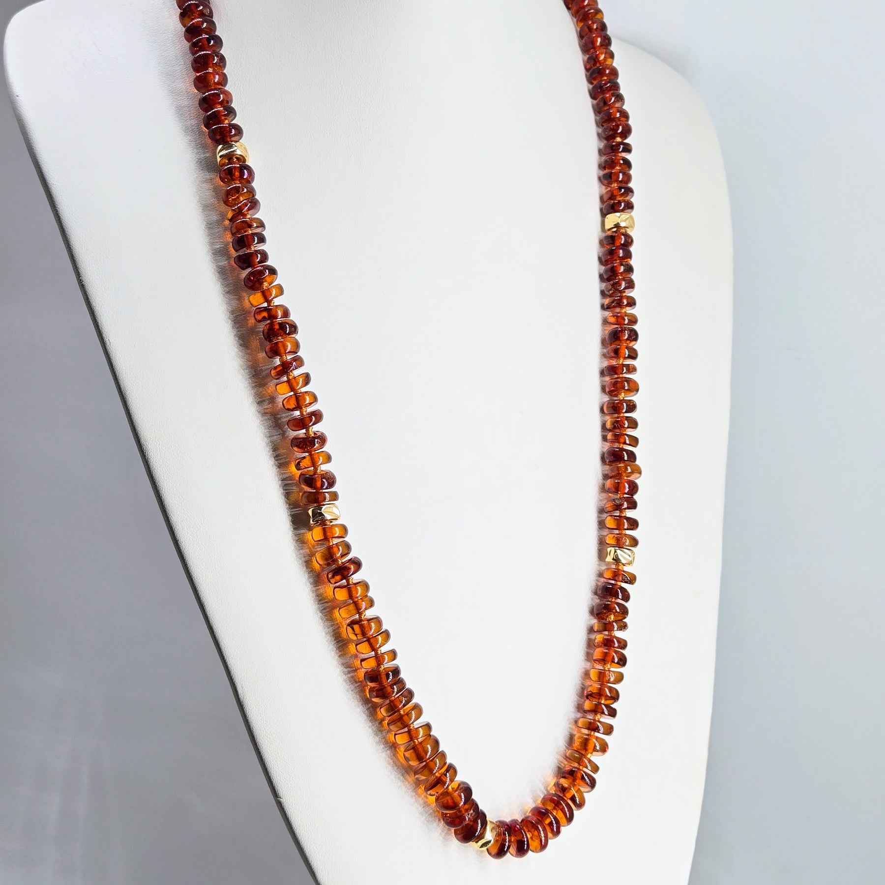 The "Ancient Wisdom" 28" Necklace consists of individually-knotted, hand-cut rondelles (appx. 9mm) of natural, Baltic Amber, with hand-formed 14k Gold accents & safety clasp (but it'll easily slip over your head). It's warm & Earthy + elegant & perfect for layering or wearing solo!