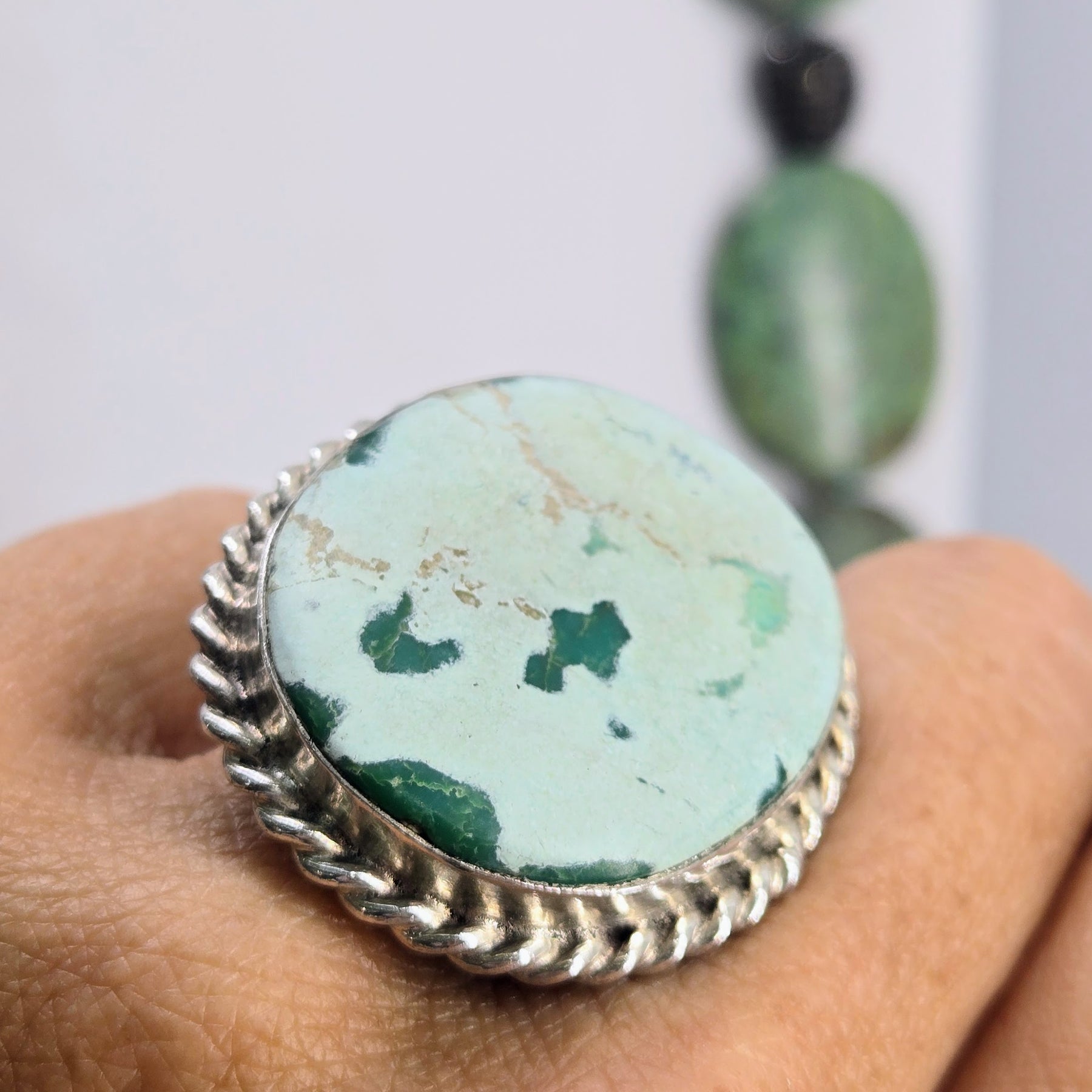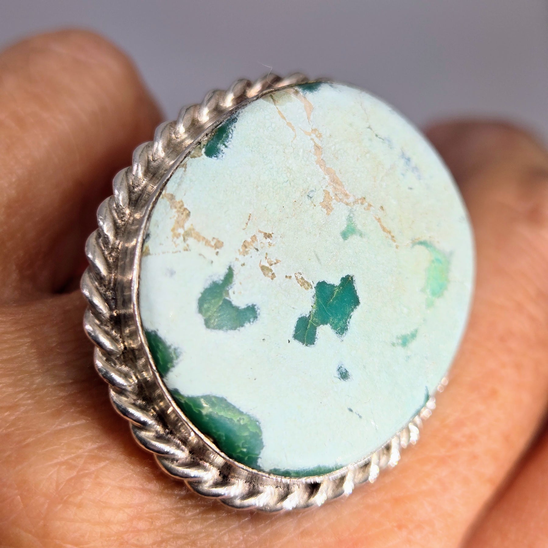 The "Jolly Green Giant" is a New-Old-Stock, Statement Ring with a Spectacularly Wild Specimen of Soft, Minty-Green Variscite + Dark Green Turquoise that's Smooth on the Face, but Shows its Wild Side with its Beautiful Matrix on the Underbelly (Appx. 1.5" X 1.25" Face) Set in a Sturdy, Hammered Sterling Band & It's WONDERFUL!