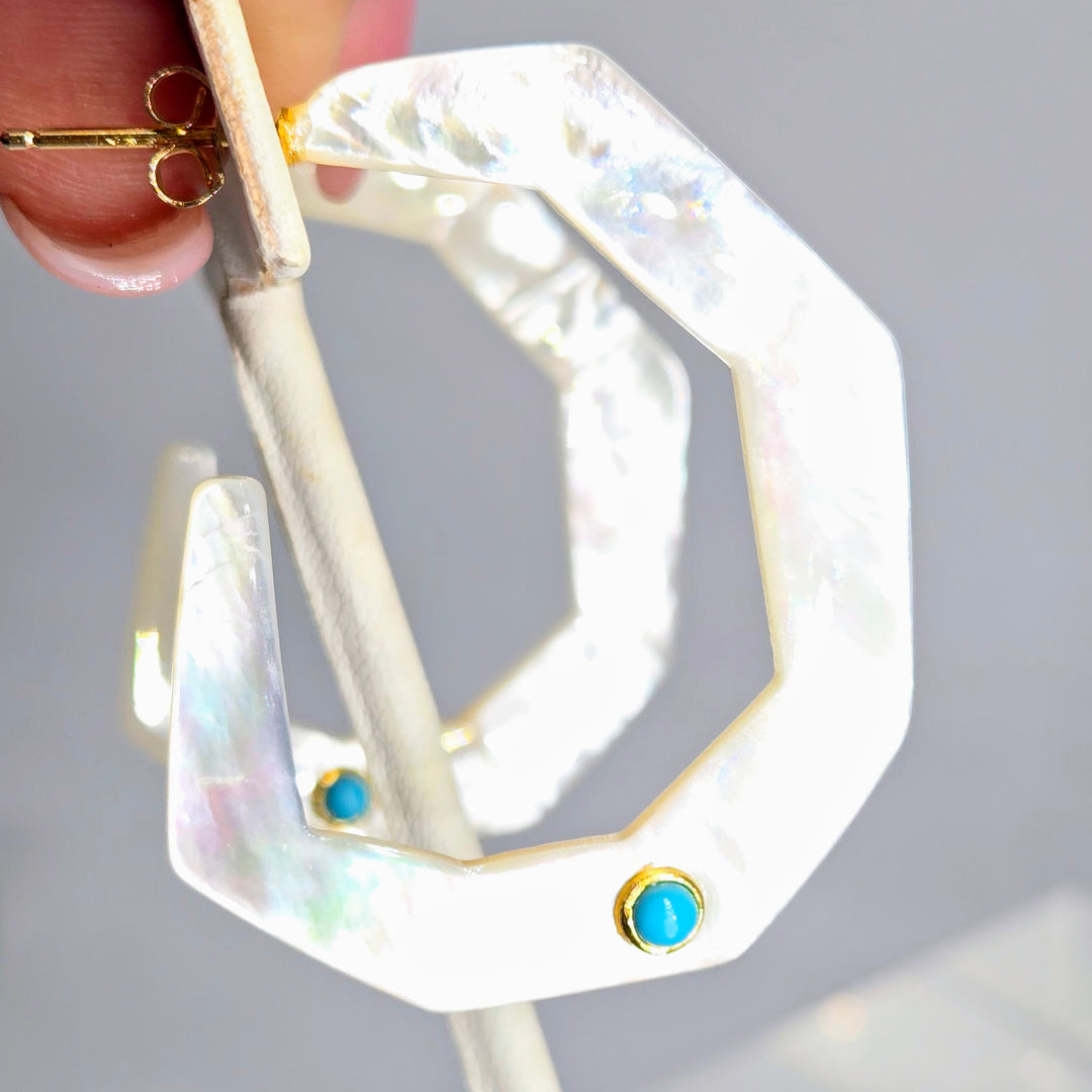 "Geo Hoops" 1.75" Earrings - Tahitian Mother Of Pearl, Turquoise, 18k Gold Sterling