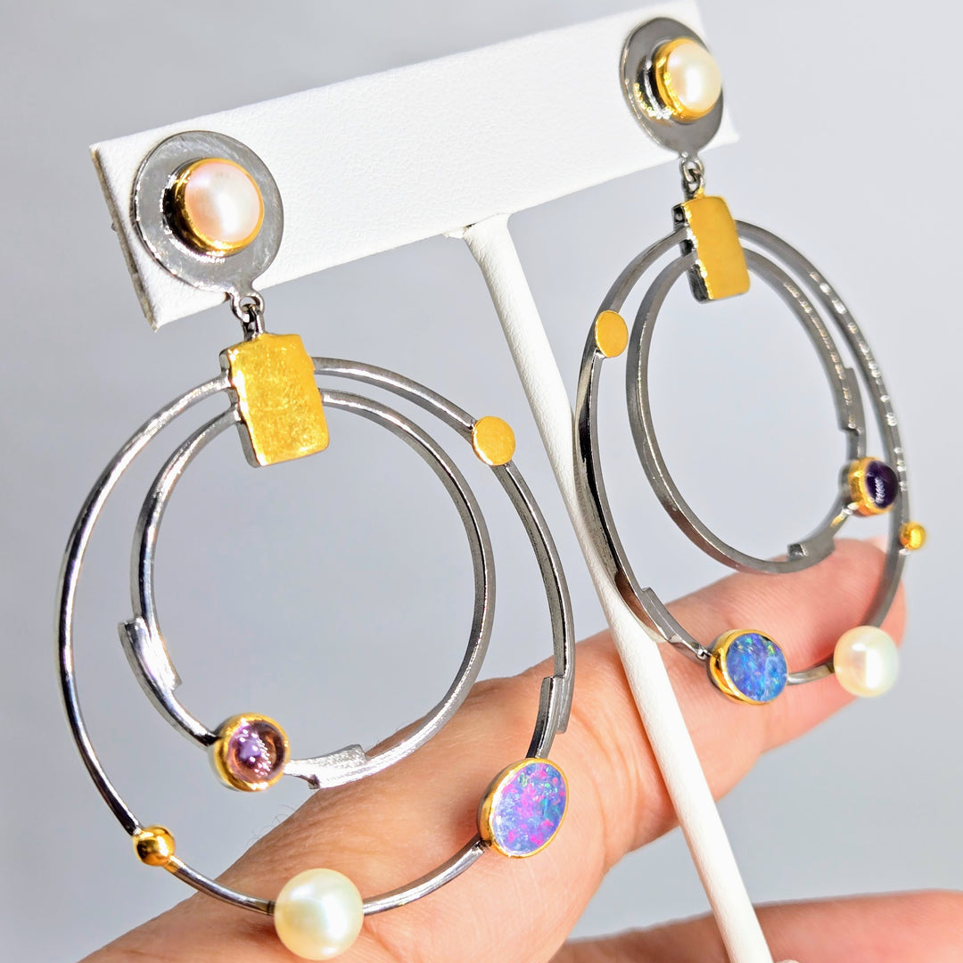 "Orbicular Beauties" 2.25" Earrings - Opal, Amethyst, Pearl, Black Sterling, 18K