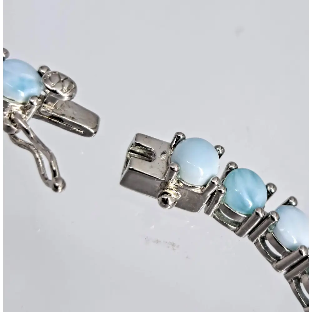 The "Salty Sea Sister" 7.5" Bracelet 7.5" Anti-tarnish Sterling, Tennis-style Bracelet with 4mm Round, Prong-set, Larimar Cabochons & a safety Clasp.