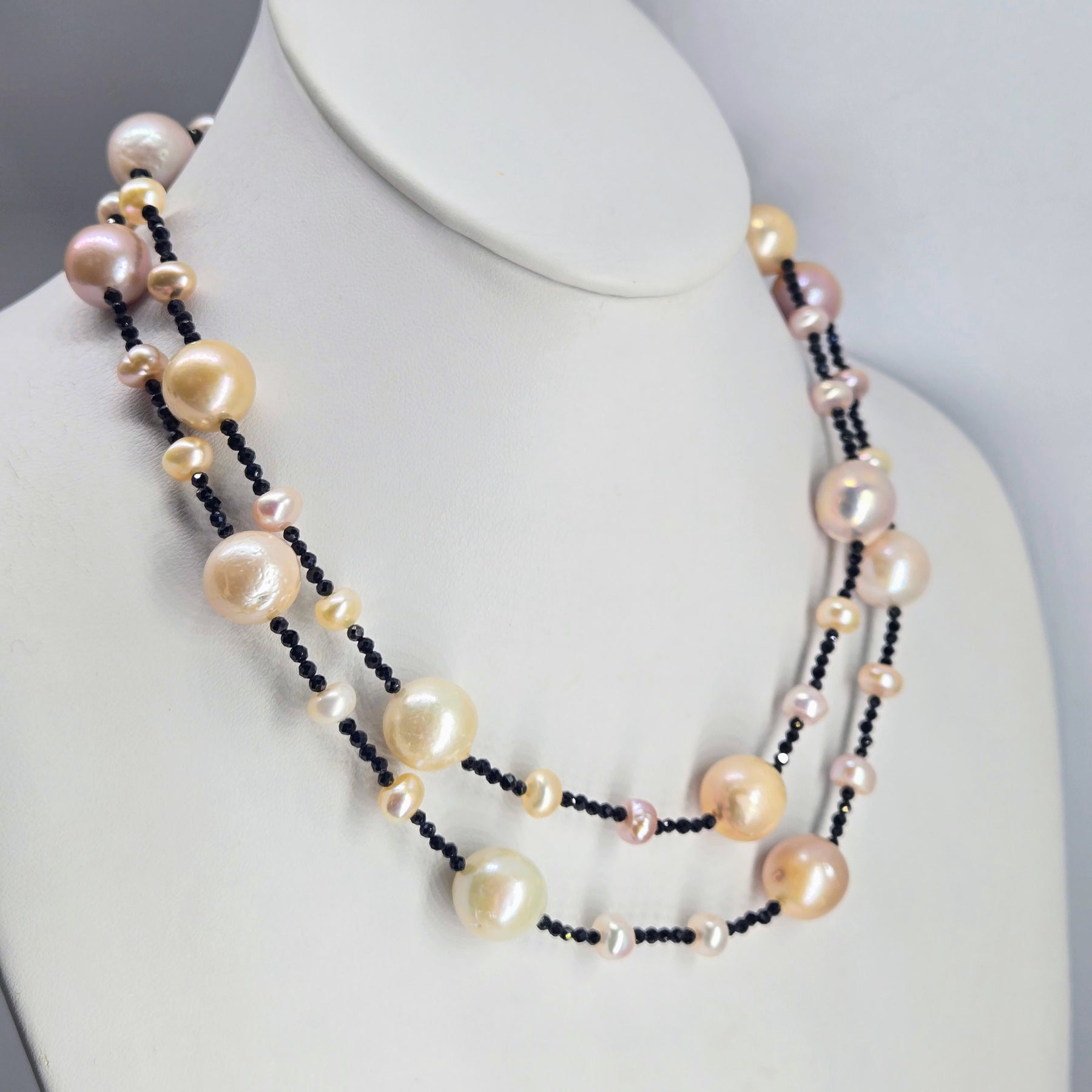 The "Baroque Darlings" are 34" Rope Style Necklaces of Baroque & Petite Pearls, stationed on 1.5mm strands of micro-faceted Black Spinel.