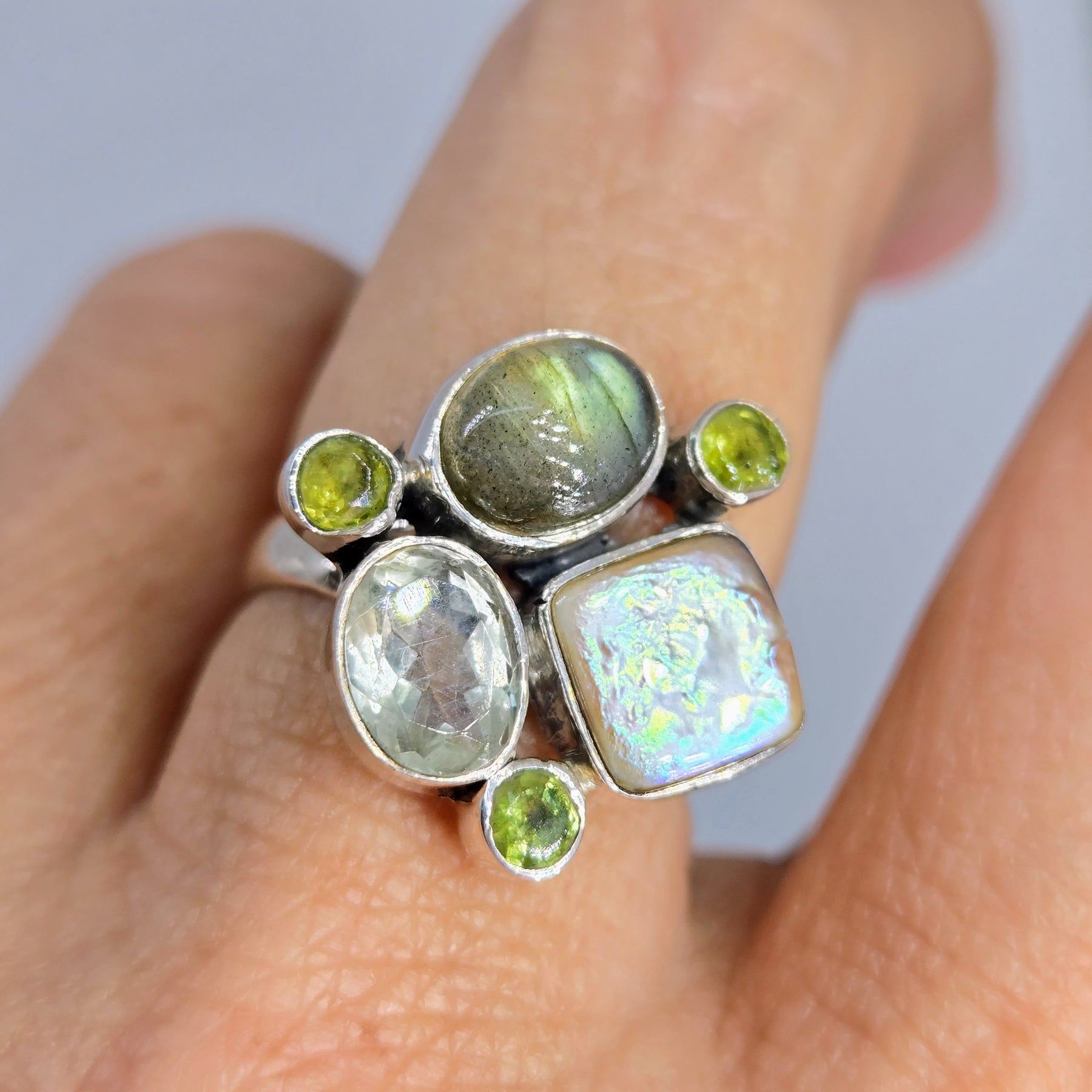 The "Froggy Spice 2" is a Size 8.25, OOAK Ring of Faceted Peridot, Prasiolite (Green Amethyst), Labradorite & Cubed Coin Pearl - Bezel-set in Sterling & Spectacular!