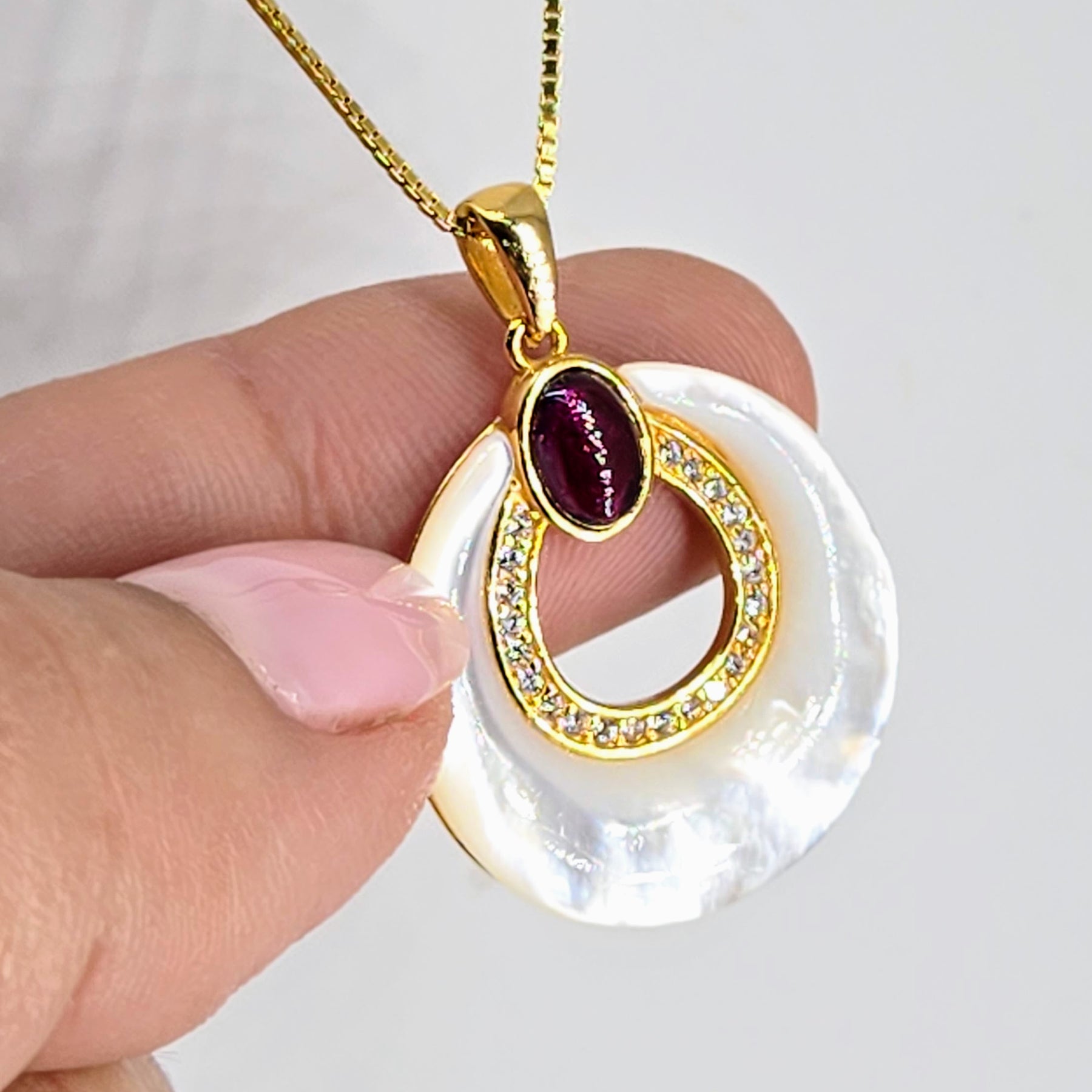 "Mother's Little Helper" is a 1.25" pendant of smooth Mother-of-pearl, with Rhodolite Garnet, & white Zircon, in anti-tarnish-treated 18k Gold over Sterling on a matching 20" chain & it's lovely!