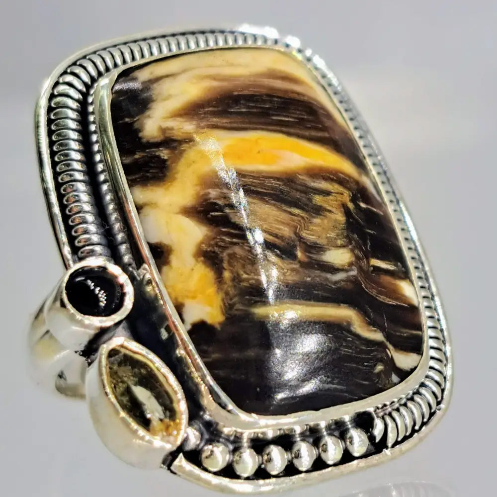 The "Brownie Points" Sz 7 Ring is Petrified Peanut Palm Wood & Tiger Eye Cabochons with Faceted Citrine & Topaz - Bezel Set, in Sterling... It's an Earthy, Sturdy & Magical, 'Feel-Good Ring! & It's a Beautiful Thing!