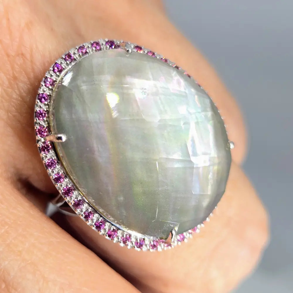 "Silver Fox" is a size 8 statement ring (appx. 1" face) featuring a faceted Quartz & Tahitian Mother-of-Pearl (from the Black Lipped Oyster) doublet (the faceted Quartz magnifies the naturally exquisite color-play of the shell & protects it!), with a Rhodolite Garnet halo in Anti-tarnish-treated Sterling & it's simply, SEXY - with its soft, moody gray-silver & pink rose undertones & halo!