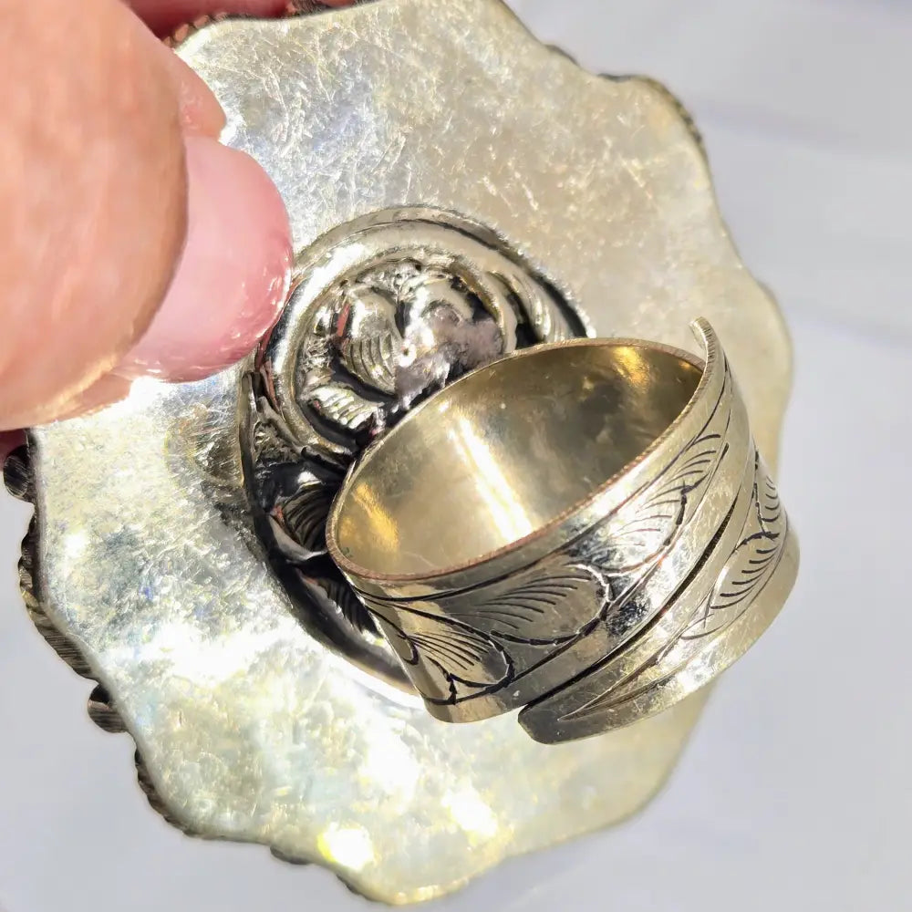 The "Southernmost Conch" adjustable size ring is a beautiful Queen Conch shell cabochon surrounded by green Turquoise, in a hand-tooled German Silver ring & it's delicious - a BOLD Statement at 1.75" X 2"!