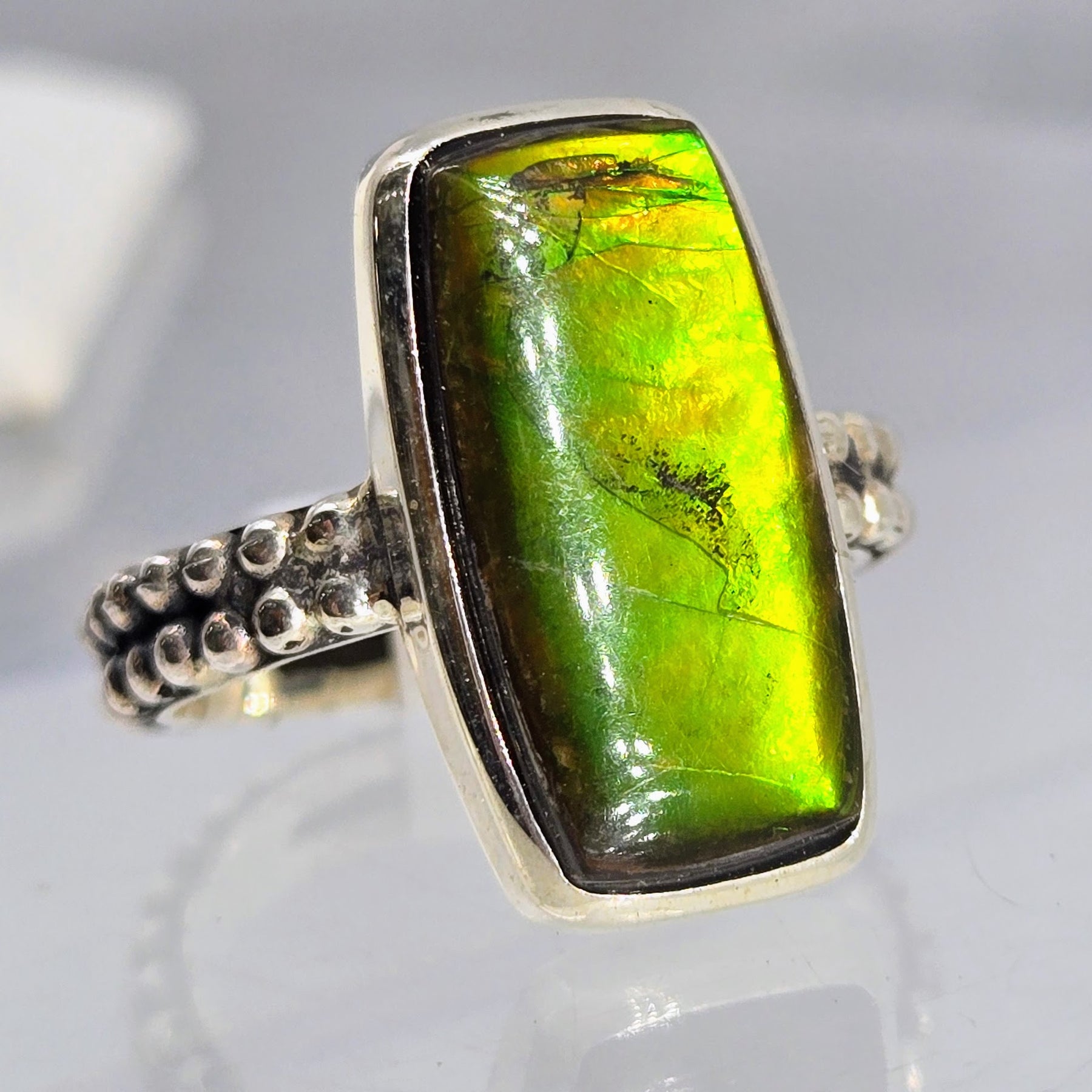 The "Green Flash!" Size 8 Ring features an incredible specimen of green Ammolite - bezel-set in Sterling with a rheticulated band & it's divine + sublime!