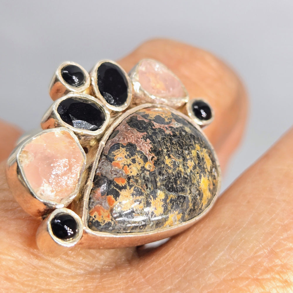 "Rhodo-licious!" Adj Sz Ring - Rhodonite, Onyx, Morganite, Sterling