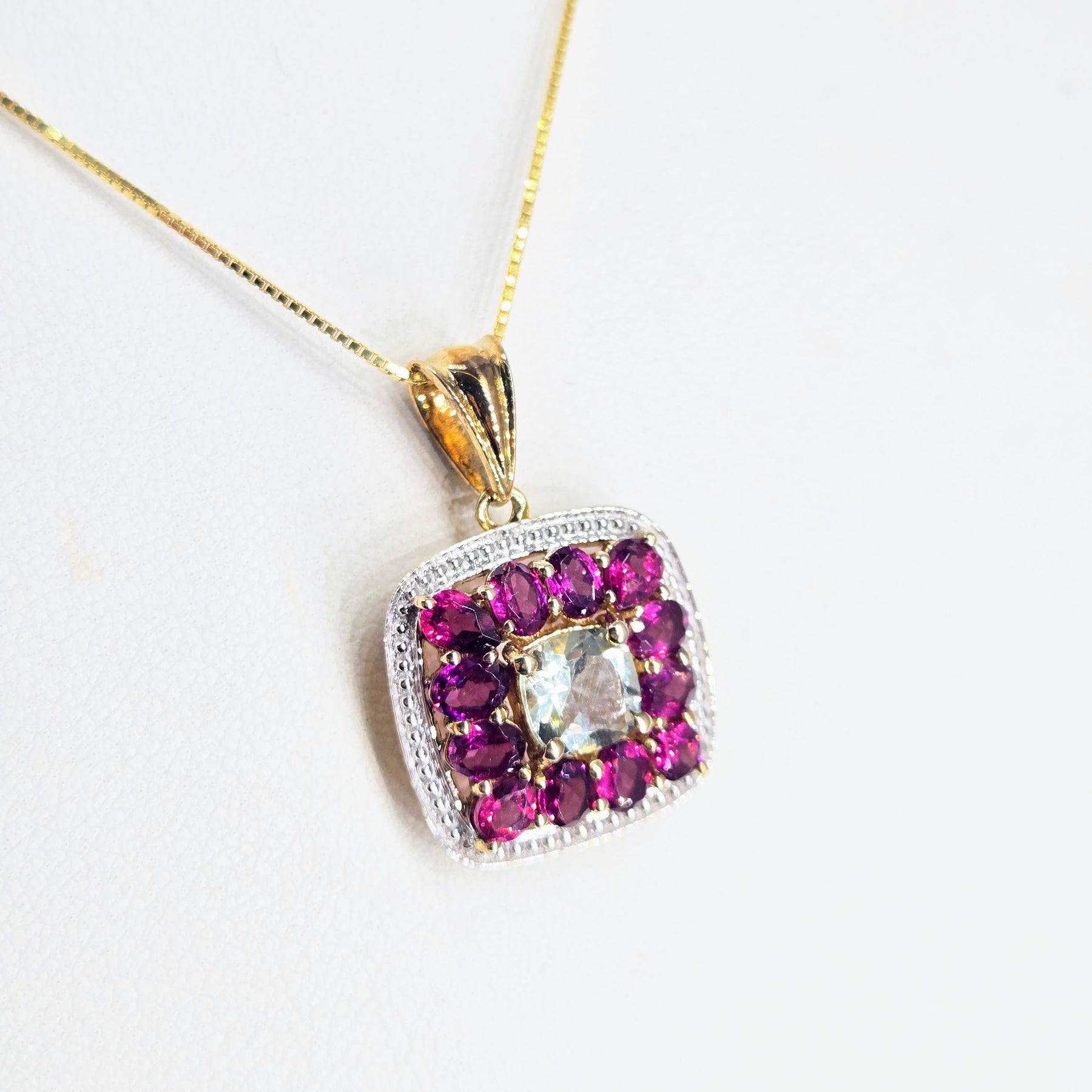 The "Beauty Bomb" is a 1" Pendant of Scrumptious Rhodolite Garnets, surrounding a beautiful Green Amethyst (Prasiolite), in 18k Gold Sterling on a matching 16" Box Chain. It's got a sizable bail. So, it could easily be worn over a small diameter gem strand, an Omega, or pearls, for different looks, but no matter how you style it, she's BEAUTIFUL!