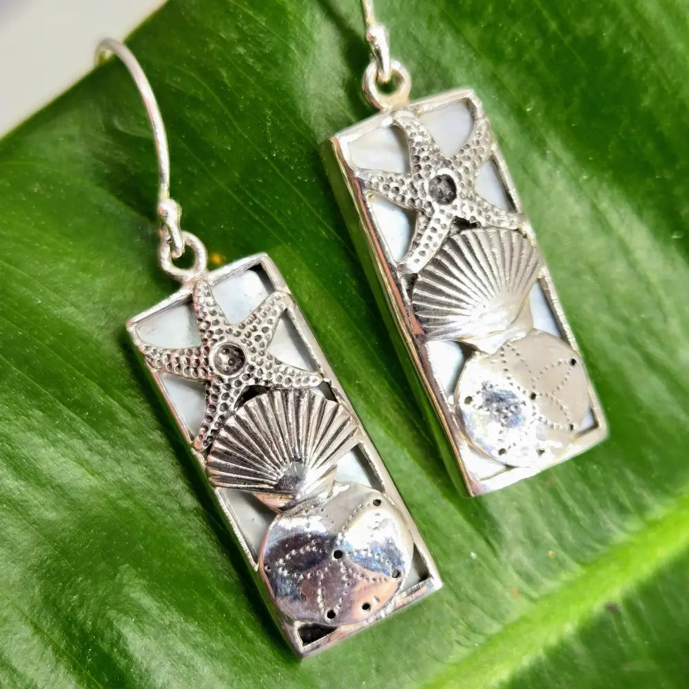 The "She-Shells" 1.5" Earrings are Mother Of Pearl, with Sterling starfish, sand Dollar, & shells in a 'frame'. They're wonderfully light, fresh & perfect for mermaids!