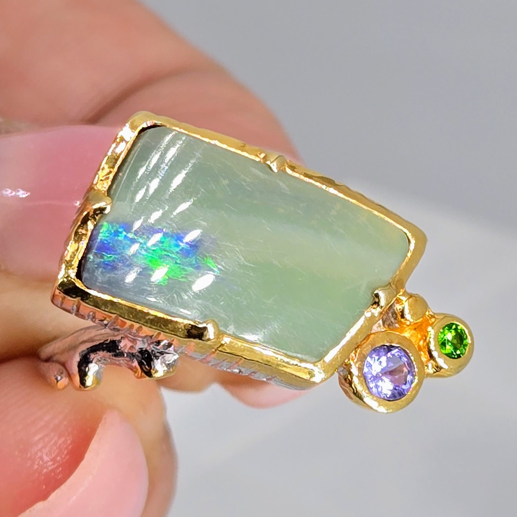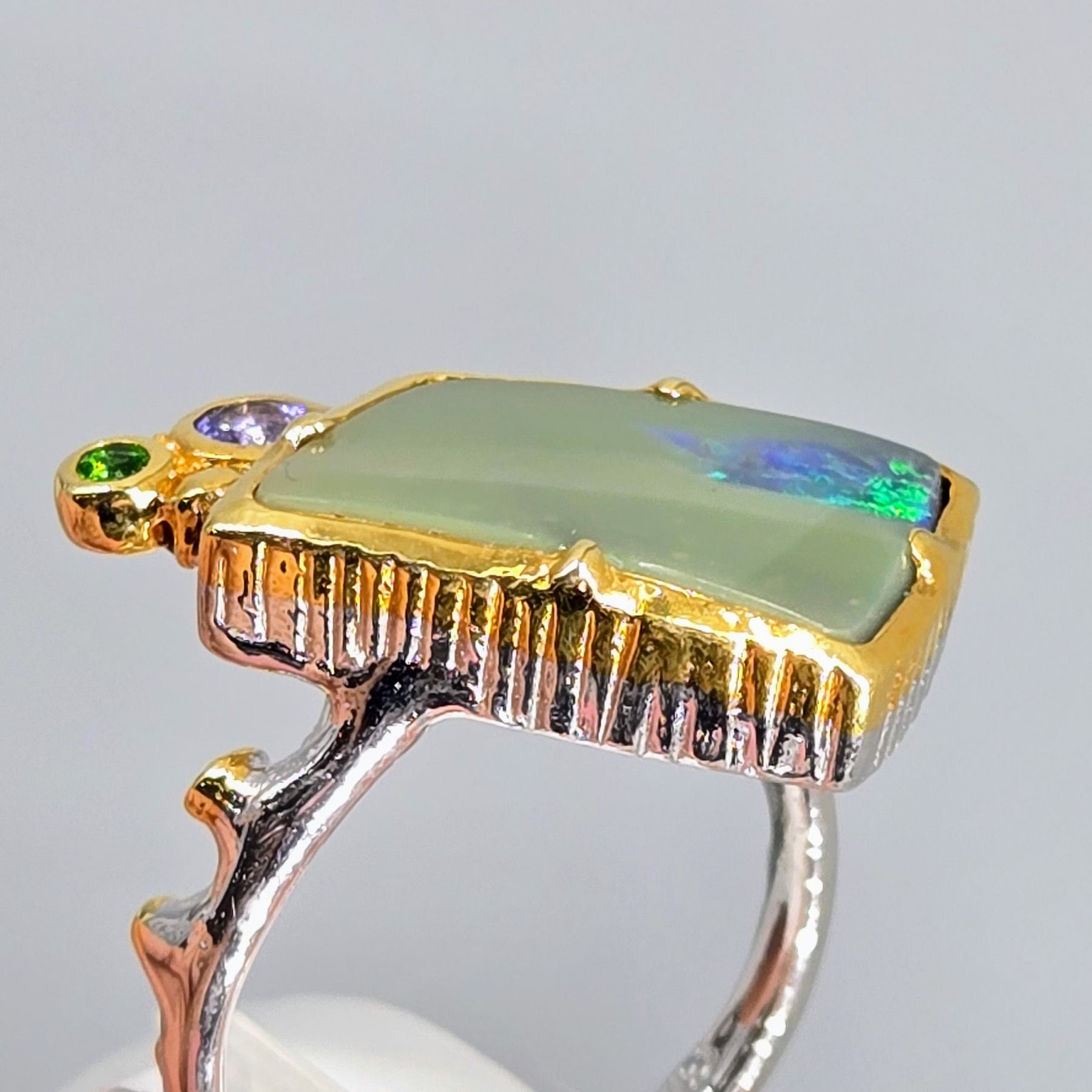The "Green Flash" is a size 6.5 Ring, featuring a really wild, Australian Opal - the main part of the stone is 'common Opal (no flash), but it's got a shockingly vivid, intense green FLASH on one side, that's like a streak of lightning! :) It's got gorgeous accent stones of Chrome Diopside & Tanzanite. These beauties are bezel-set in a Sterling band with 18k Gold accents & it's SO FABULOUS!