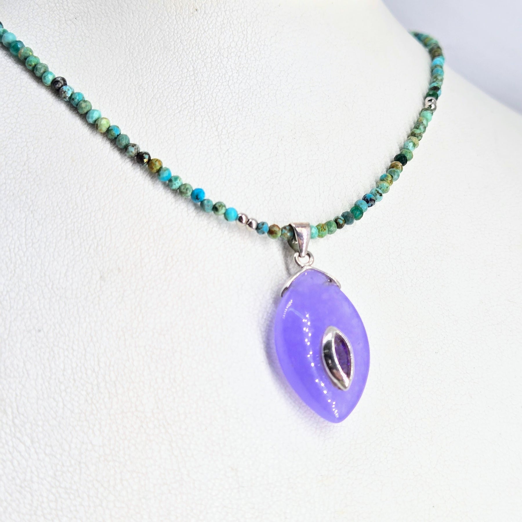 The "Enchanted Garden" is a 1.25" Pendant of a bezelled Amethyst Marquis in a smooth Lavender Jade ellipse on a 2.5mm, 16" - 18" (2" extender) Necklace of microfaceted Turquoise with Sterling accents & findings. It's simply divine!