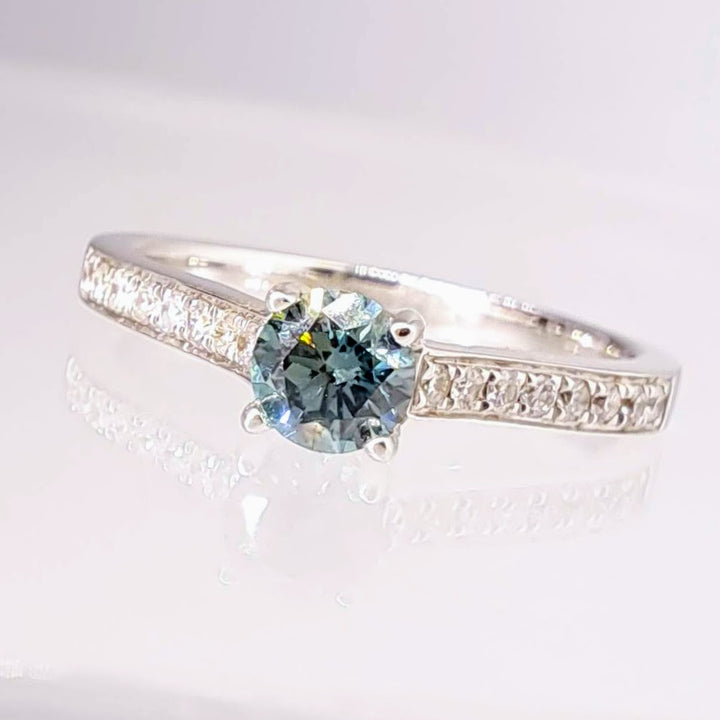 The "Beautiful Dream” is a Size 6.5 DAZZLER of an Engagement Ring, Featuring a Fancy Cut, .32 Ct Natural Blue Diamond with .13Ctw White Diamond-studded, Sparkling Shoulders, in 18K White Gold. It is PRECIOUS!