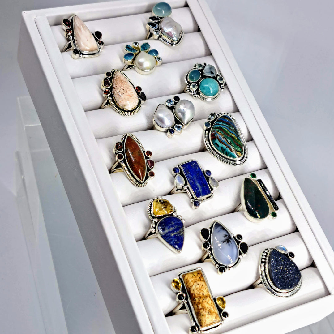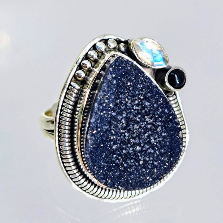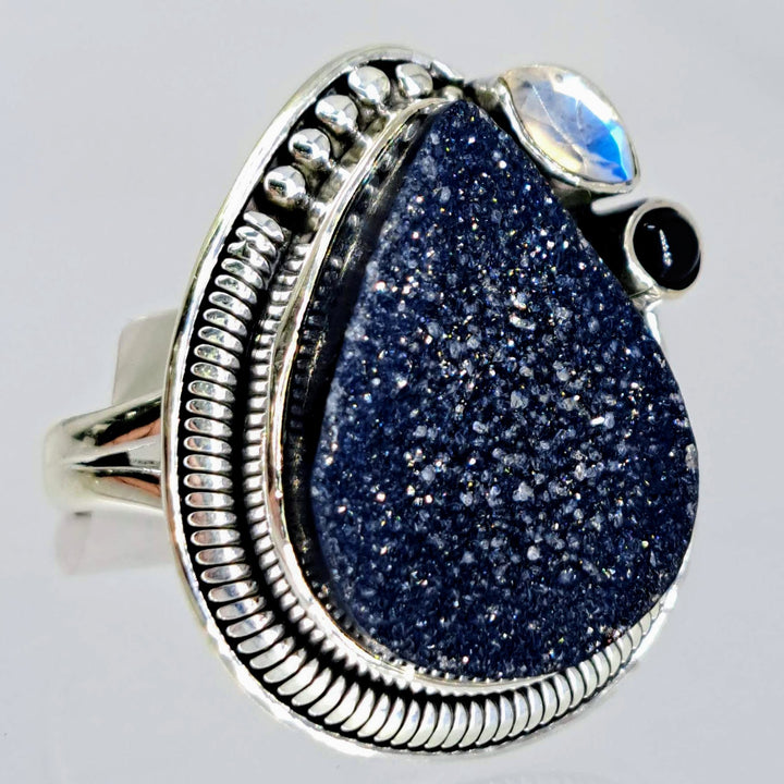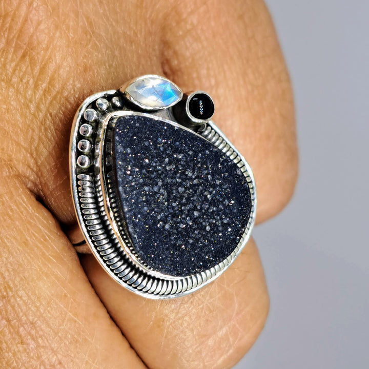 "Black Sugar" Sz 7 OOAK Ring of Black Druzy, a Blue-flash Moonstone & Onyx Accents - All, Bezel-Set in Super-Style-y Sterling & SO Damned Great-Looking!