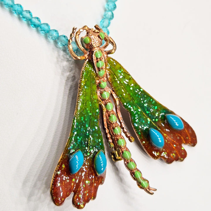 The "Blue Sky Fly" is an Incredible Necklace/Brooch Combo of a 16" to 18" Necklace of Heavenly, Appx. 3mm, Micro-faceted, Topaz-Blue Crystal - Finished with Sterling Lobster Clasp & a Gorgeous, Art Nouveau Style, Hand Enameled, Appx. 2" X 2" Bronze Dragonfly Brooch (Included) - Which is Perfect Flying Solo Or Worn Clipped Over the Strand, as a Pendant!