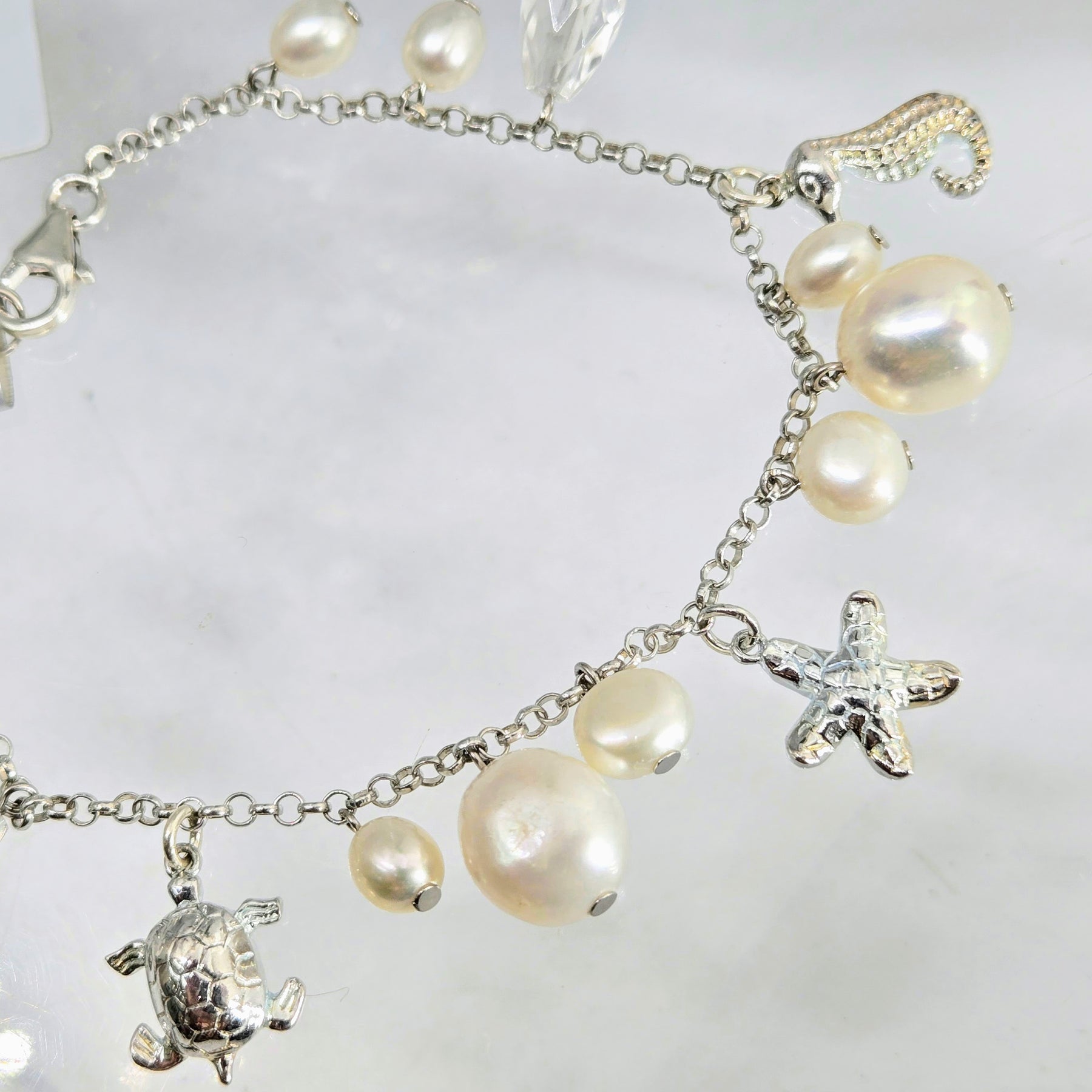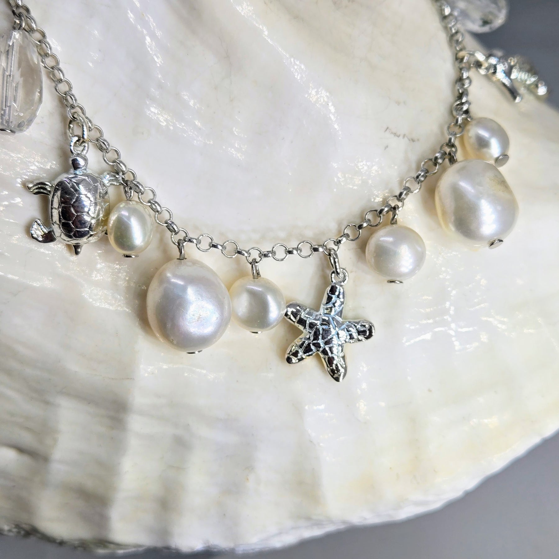 The "Island Charm" 16" - 18" (2"  Extender) Necklace Features Dangling Pearls, Quartz & Sea Life (Turtles, Seahorse & Starfish) in Sterling Silver with an easy-to-use Lobster Claw Clasp & it's Simply CHARMING! :D