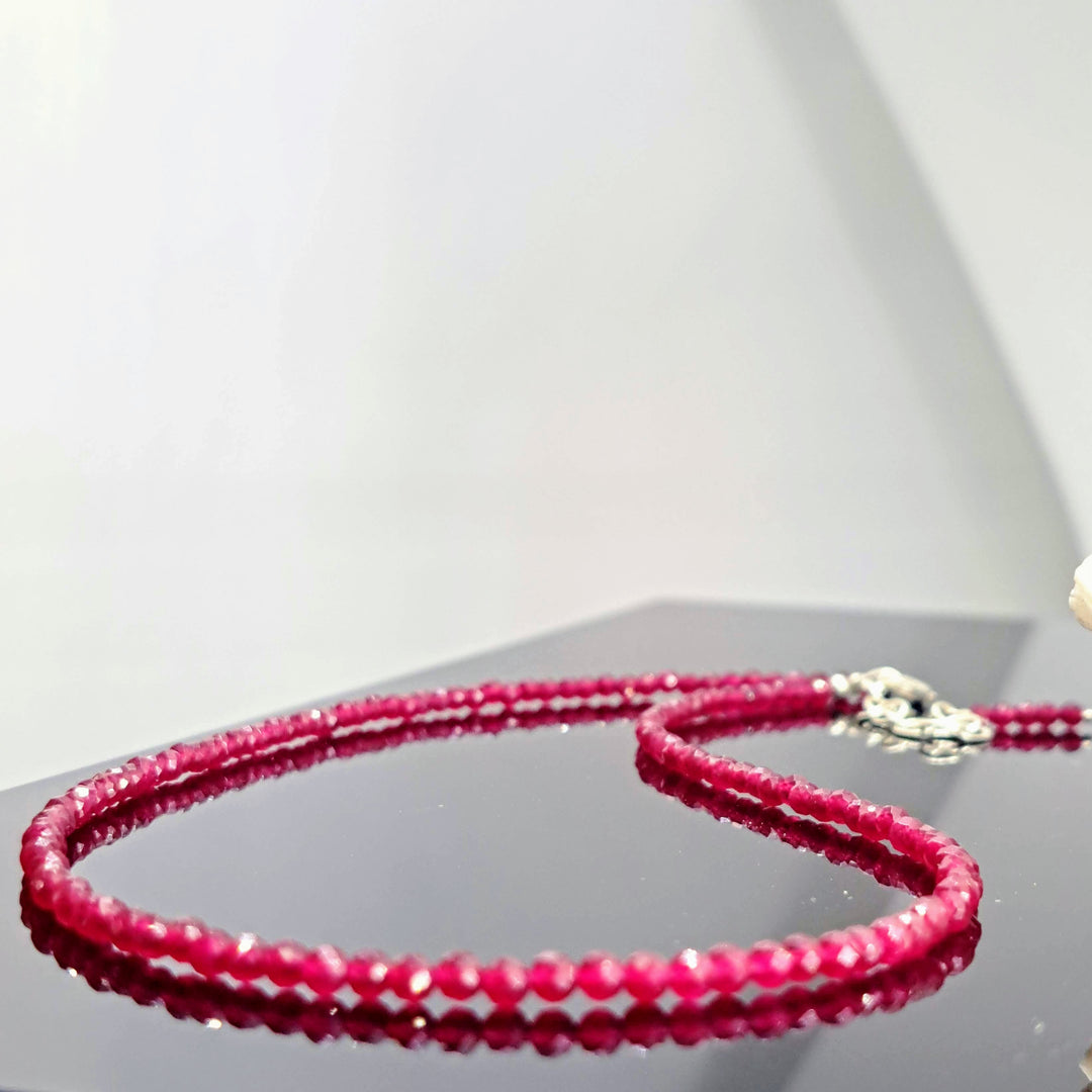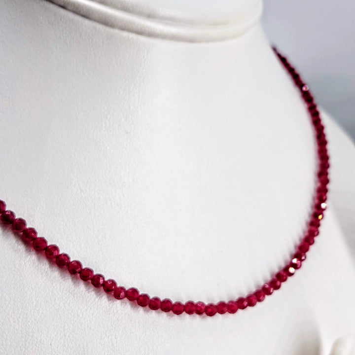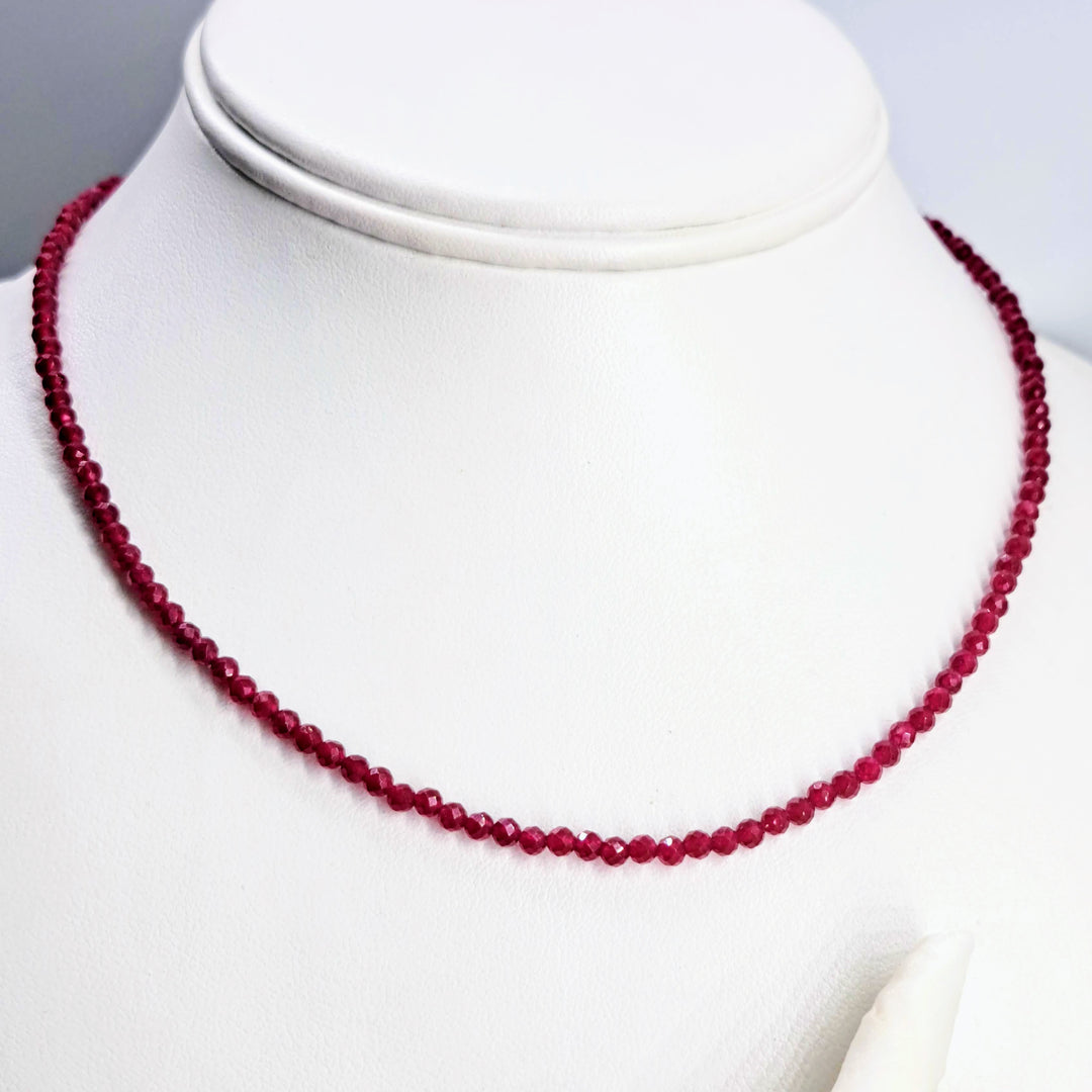 The "Ruby Gem Strand" is an Adjustable Length (16" - 18") Necklace of 3mm Microfaceted, Gem-quality, Scrumptious-Scarlet Rubies on a Strong, yet Supple Flex Strand, Finished with Sterling Findings & Finial. It's Simple Elegance!